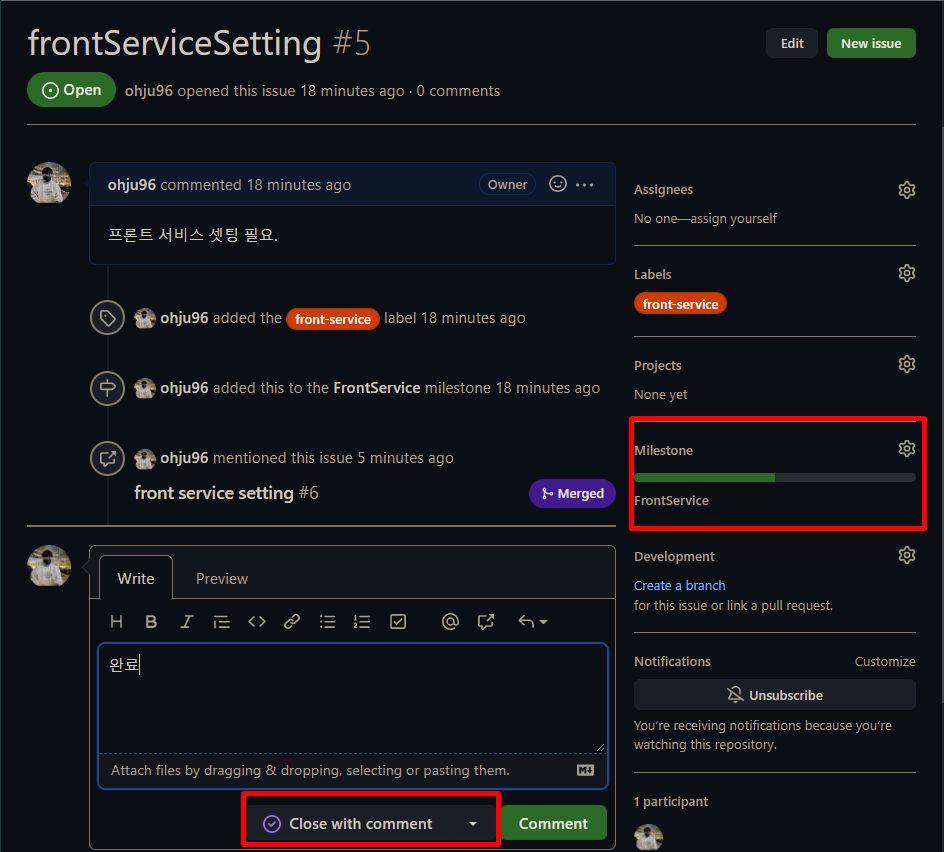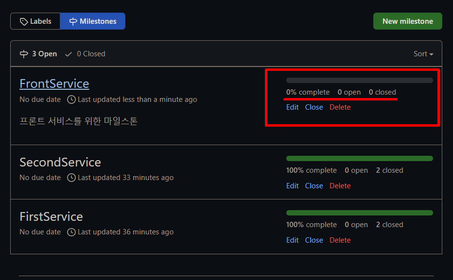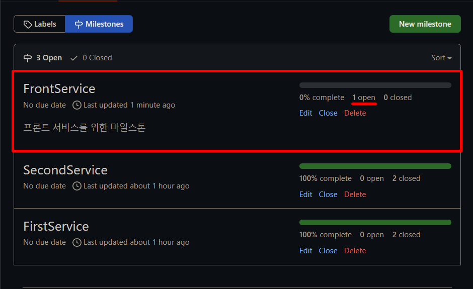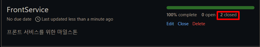 이때, 마일스톤의 변화를 체크해 보면 FrontService에 만든 이슈가 하나 생겼기 때문에 open이 1카운팅 되었다. 위에서 확인한 이슈가 Open 상태였던 것을 생각해 보면 아직 열려있는 이슈는 하나고 닫힌 이슈는 0개이기 때문에 complete는 0%인 것임을 알 수 있다.