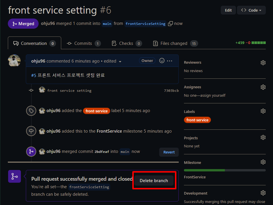 위에 목록을 보면 merged가 된 것을 확인할 수 있다. 사용한 브랜치는 delete해준다.