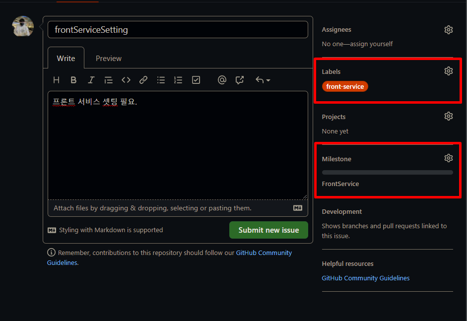 여기서 체크해 볼 것은 우측에 라벨과 마일스톤 탭이다. FrontService마일스톤에 들어와서 이슈를 생성한 것이기 때문에 마일스톤은 자동으로 FrontService를 가리키고 있지만, 라벨을 따로 설정을 해 주지 않으면 체크되어 있지 않다. 이때, 톱니바퀴 설정 모양을 클릭해 아까 생성한 front-service를 체크해 라벨을 달아준다. 참고로 라벨은 여러개 달 수 있다.