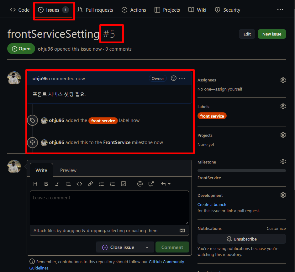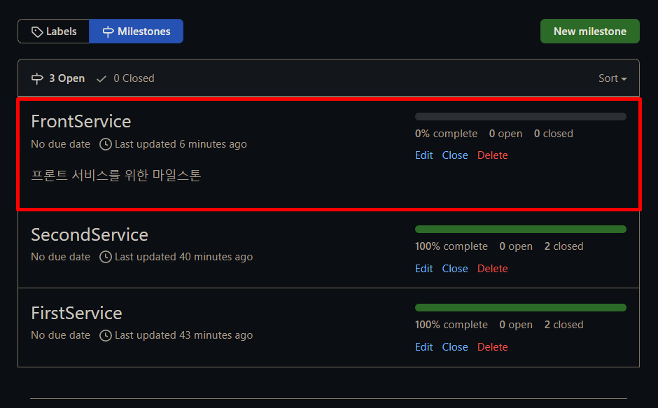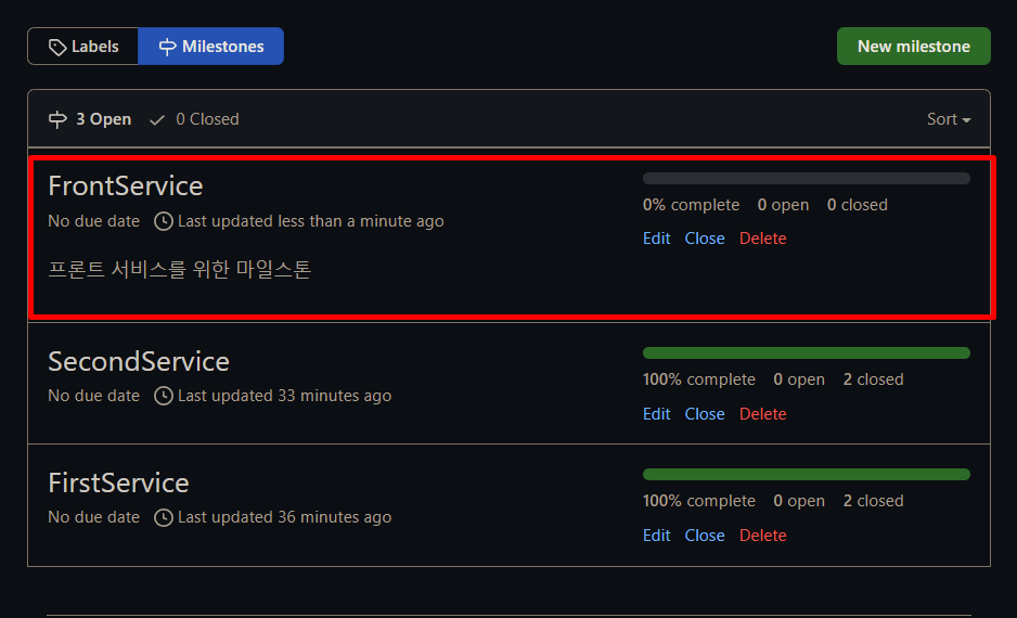 이렇게 생성하고 나면 FrontService가 마일스톤 탭에 잘 나타난다. 아까 설명도 간단하게 적어주어서 같이 표시된다.