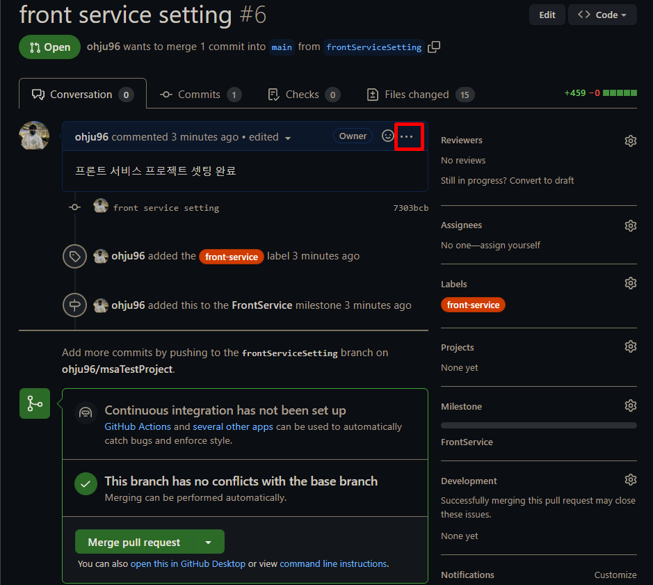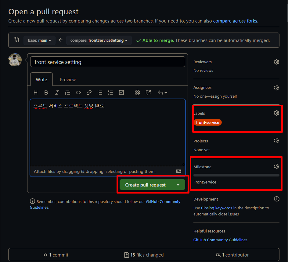 여기서 간단하게 설명을 적어주고, 우측에 라벨과 마일스톤을 따로 설정해 준다. 아까 생성한 frontService에 맞게 두 ㄹ다 설정을 해주고 PR을 날려준다.