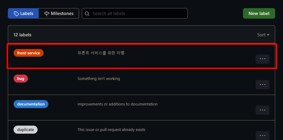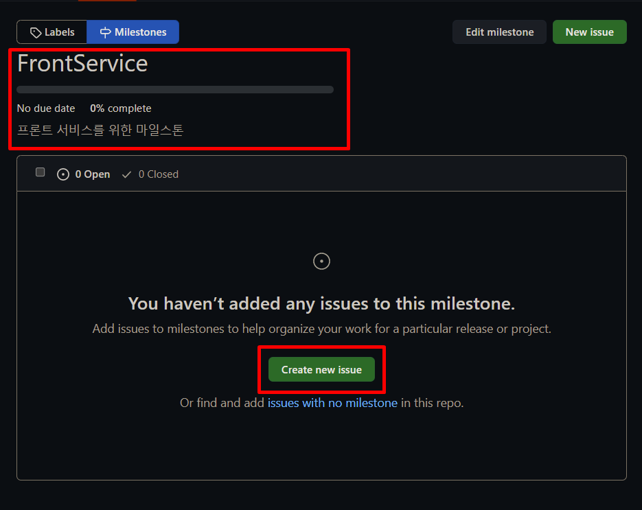 라벨도 만들었겠다. 이제 다시 마일스톤 탭으로 온다. 여기서 FrontService 마일스톤에 대한 이슈를 생성하고 프로젝트를 셋팅하고 이슈를 달성해서 complete와 open, closed가 어떻게 변화되는지 체크해 볼 예정이다.