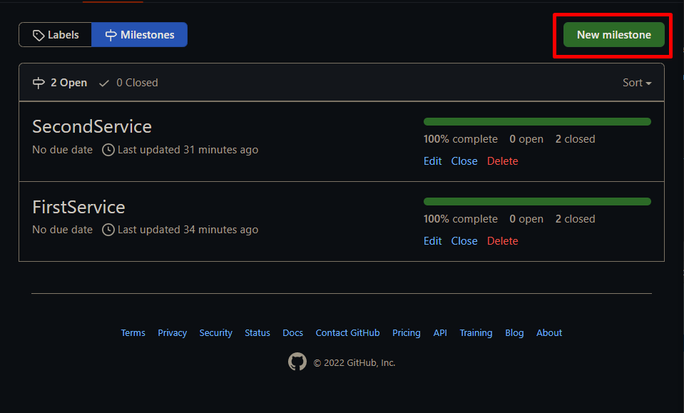 FirstService와 SecondService는 사전에 테스트 해 본 마일스톤이다. 이번에는 FrontService를 만들어 본다. New milestone을 눌러 새로운 마일스톤을 생성해 준다.