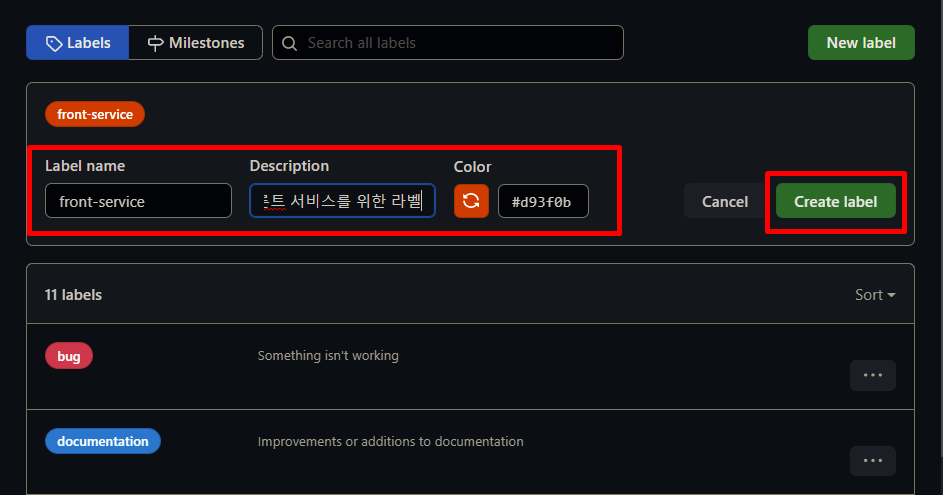 간단하게 라벨 네임을 적어주었다. msa를 활용할 때 프론트 서비스를 만들면서 달아 줄 라벨을 만들 예정이라. 간단하게 설명도 적어주었다.