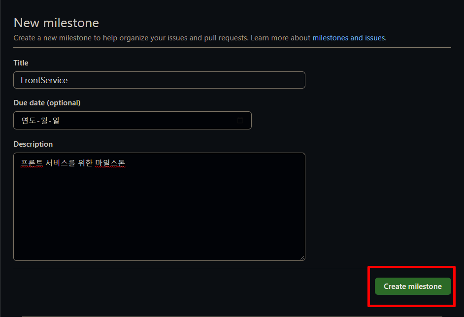 마일스톤 이름과 만료일자, 설명을 적어준다. 혼자 해 보는 것이라 따로 만료일을 적어주진 않았다.