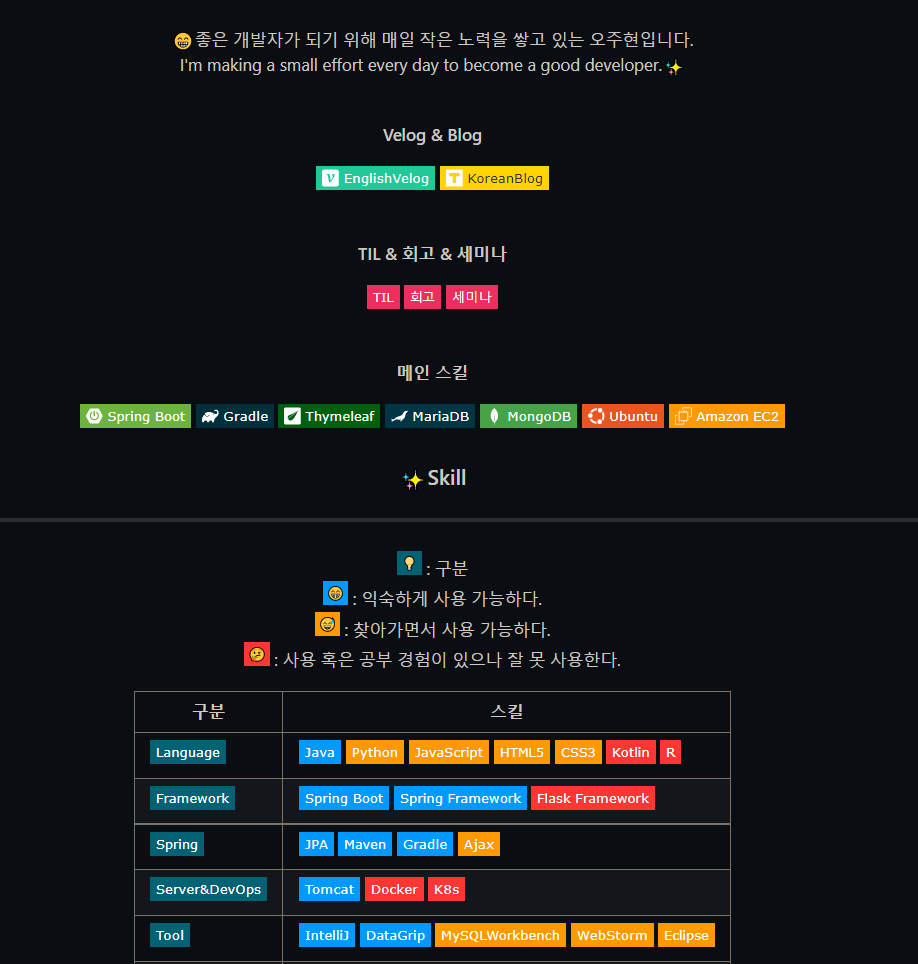 리드미 파일을 만져봤다. 이제 취업 준비를 해야 하기 때문에 슬슬 프로젝트 정리와 깃 관리, 블로그 관리, 이력서 관리를 들어가야 한다. 원티드에 이력서를 일단 작성해 뒀고 공개해뒀다.