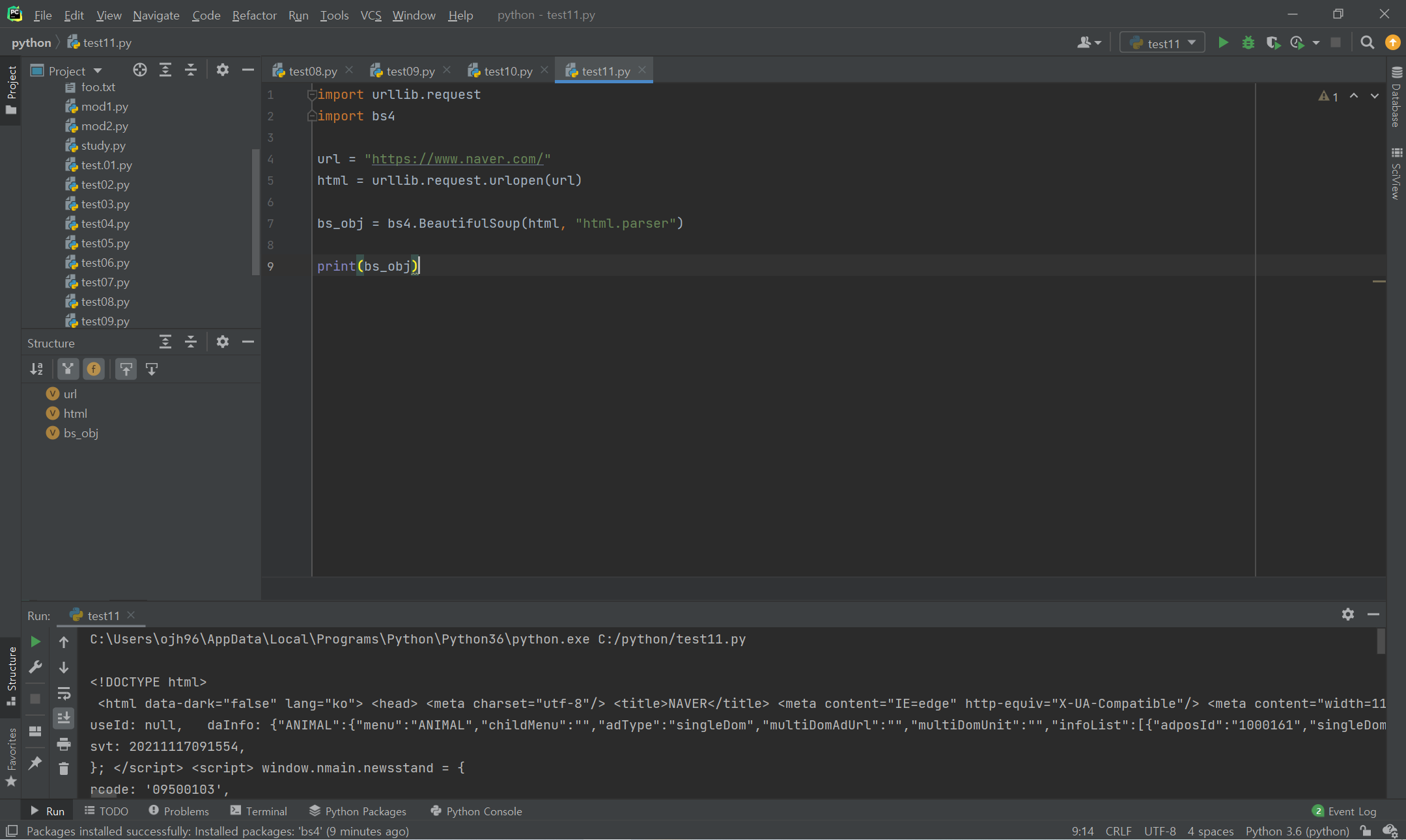 에서 html이라는 변수 안에 텍스트 형식으로 네이버 첫 페이지를 호출한 데이터가 문자열 형태로 저장됩니다.