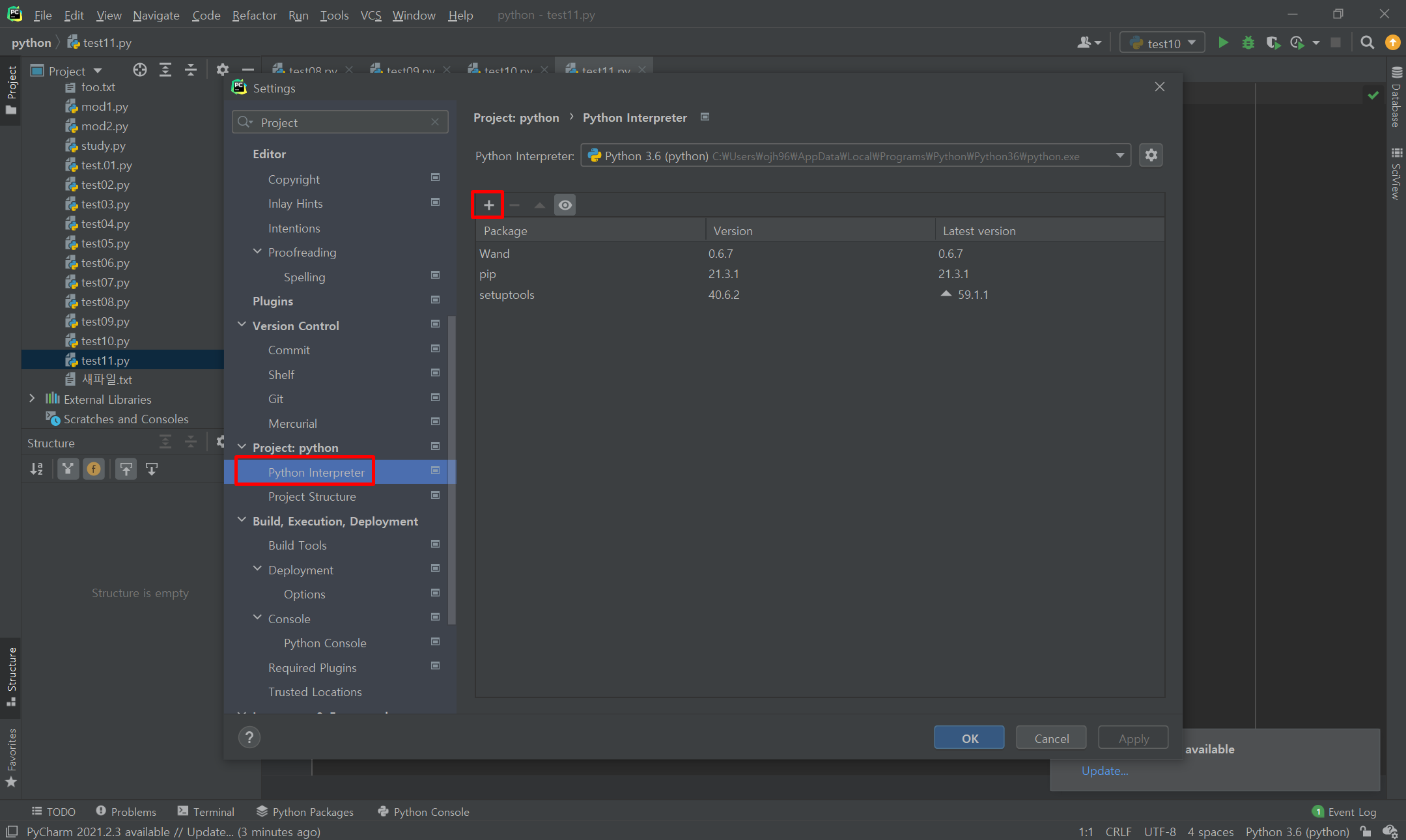 Project Interpreter을 선택해 주고 좌측 상단에 + 버튼을 눌러줍니다.