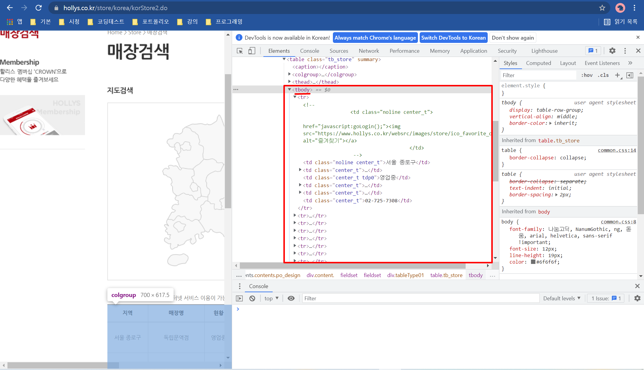 매장 검색 페이지에서 HTML 소스를 분석해 보면 <tbody> 태그가 매장 정보 테이블임을 알 수 있습니다.