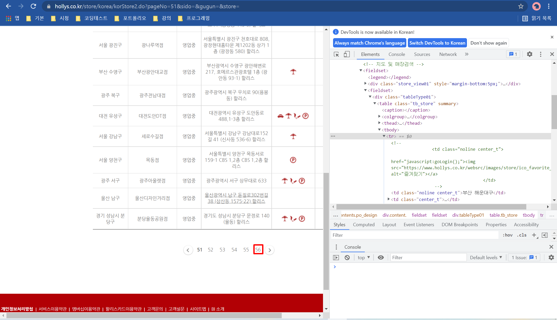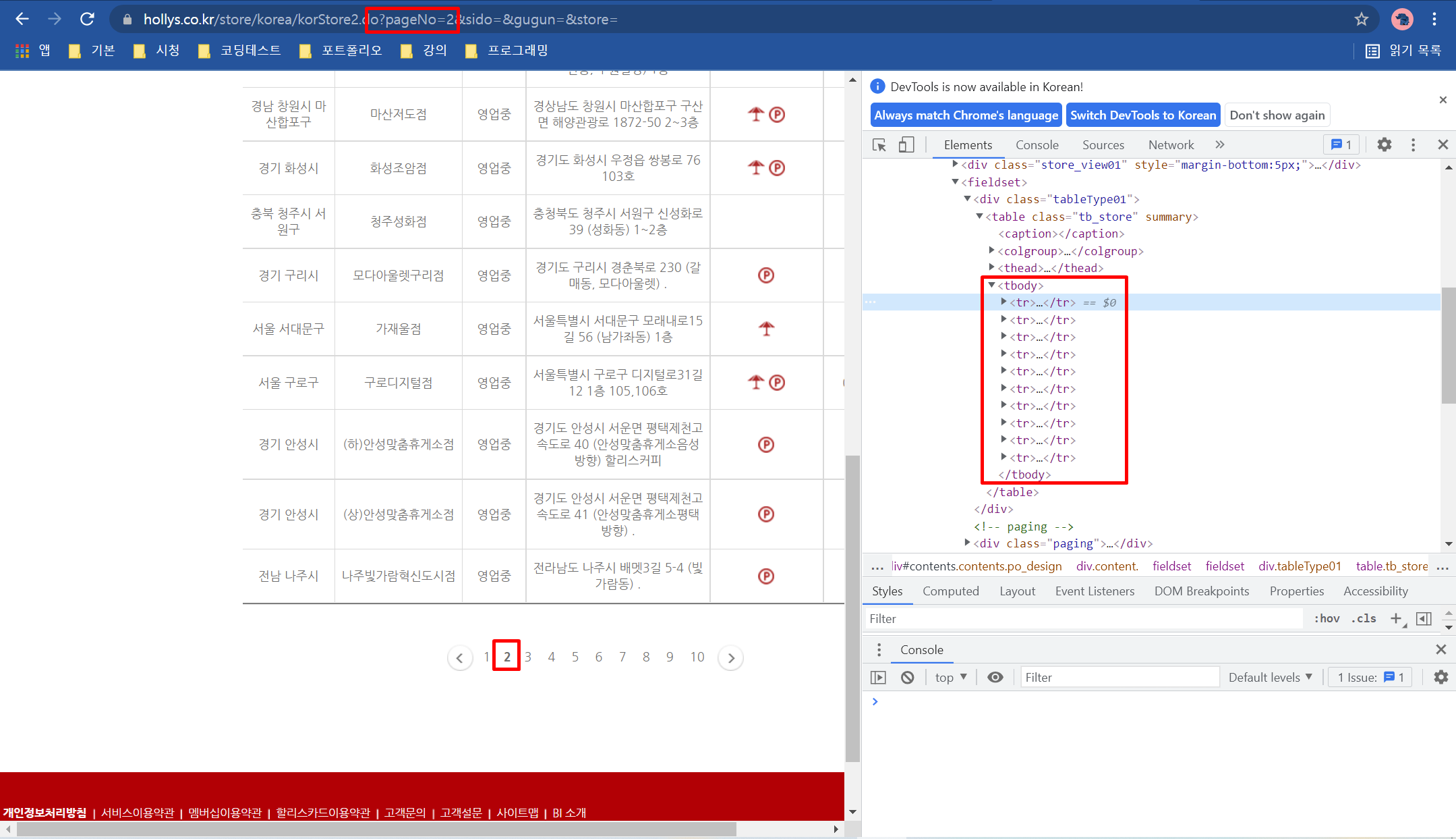 <tr> 태그가 10개씩 보이기 때문에 다른 매장을 추가적으로 더 보려면 다음 페이지로 이동해서 확인해야 합니다.