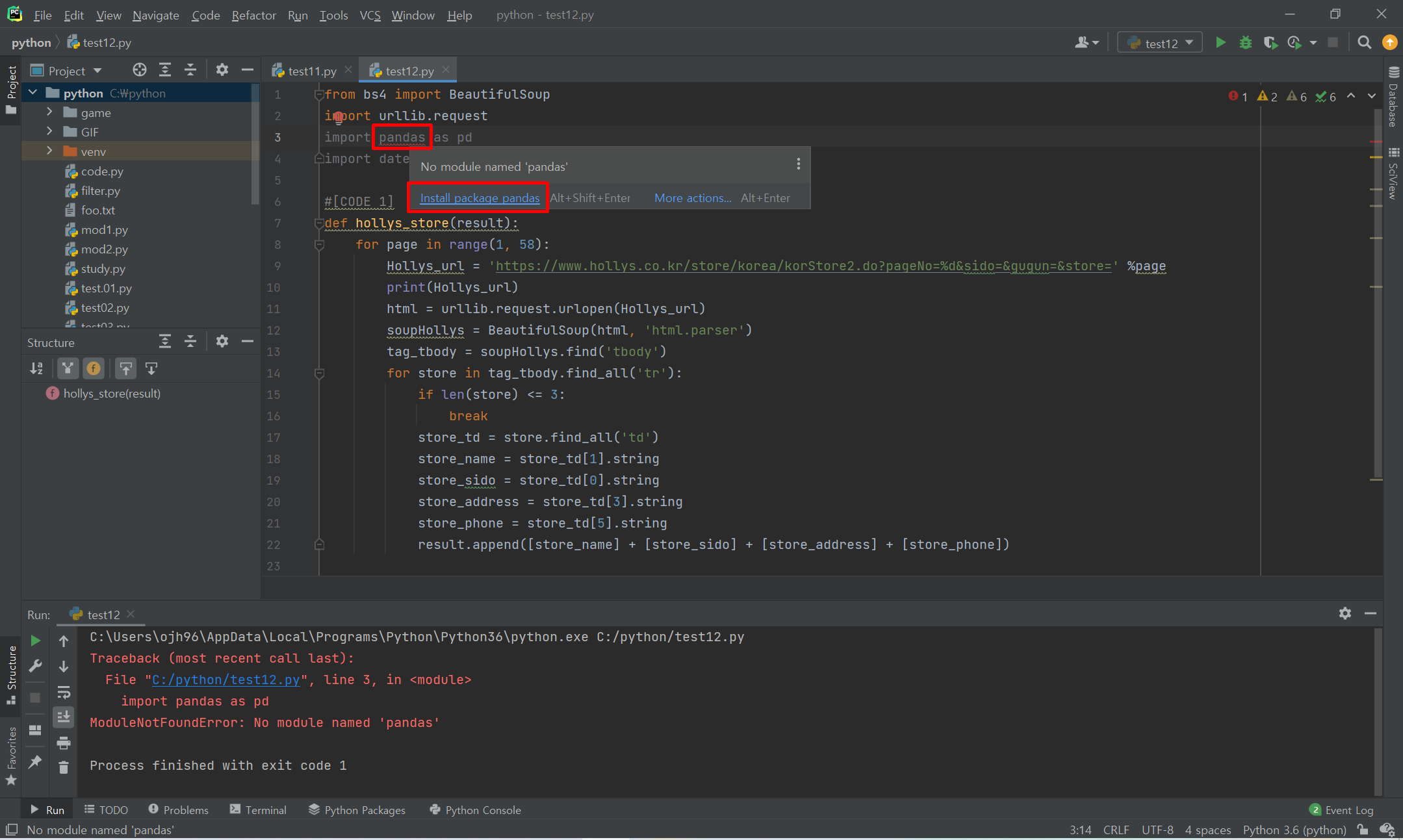 오류가 떠서 확인해 보니 pandas 패키지를 다운하지 않았습니다.