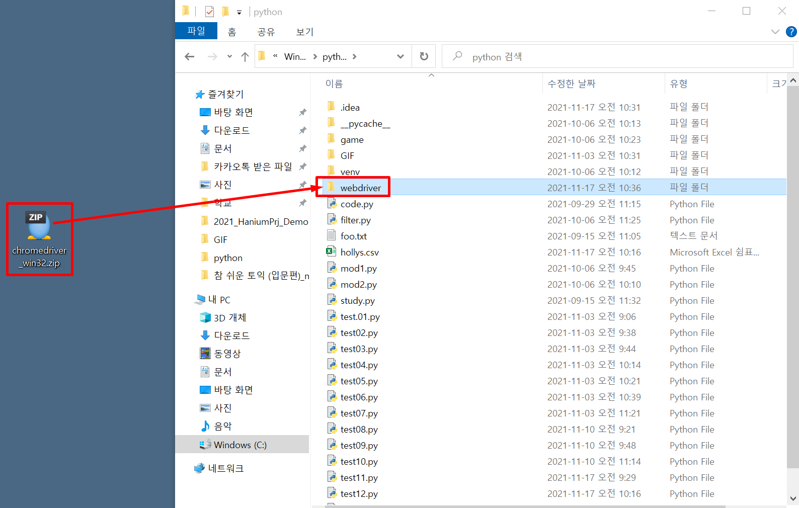 파이썬이 있는 경로에 webdriver 폴더를 생성해주고 알집을 옮겨줍니다.