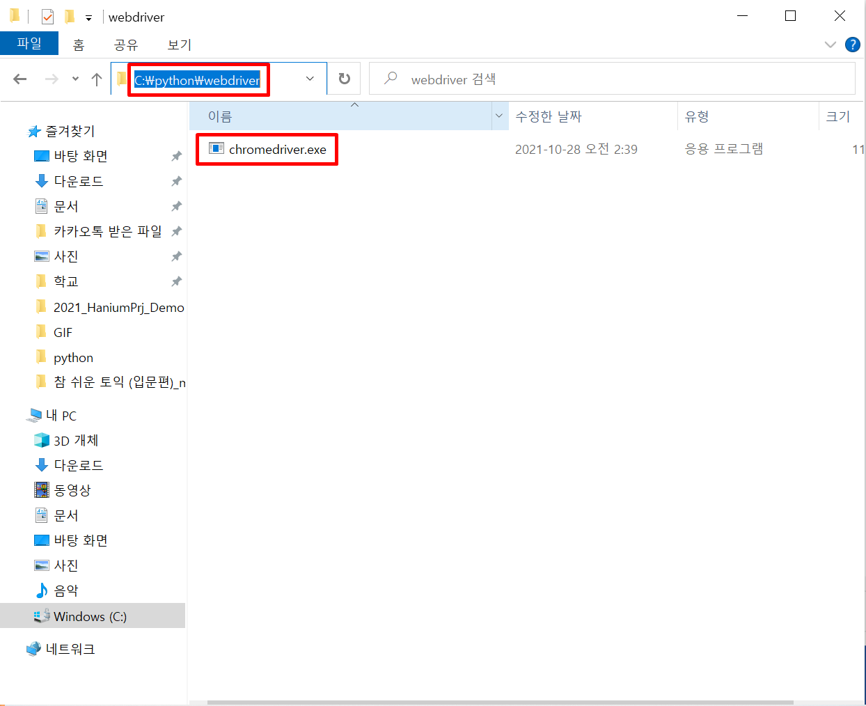결과적으로 이렇게 파이썬 파일 아래 webdriver 폴더 안에 exe파일을 남겨둡니다.