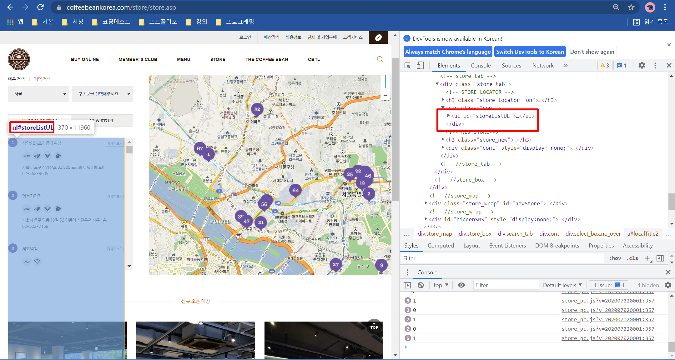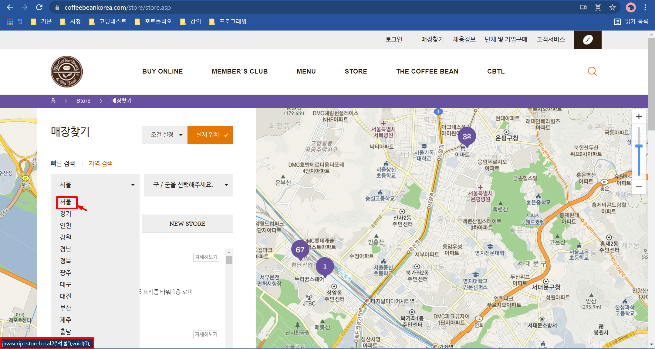 지역 검색 탭에서 서울을 선택하면 매장 70개 목록이 표시되고 서울을 선택하기 전 마우스를 올리면 좌측 하단에 자바스크립트가 표시됩니다.