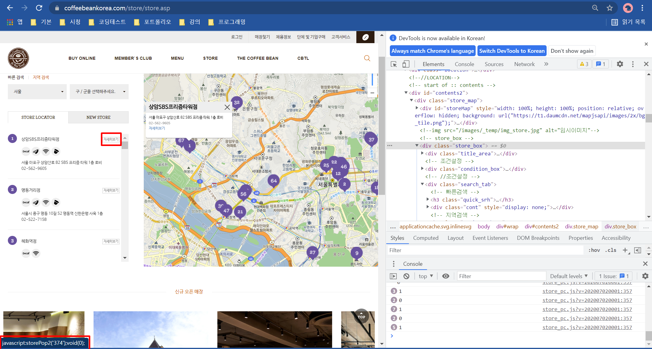 매장 목록의 자세히보기 버튼에 마우스를 올리면 하단에 자바스크립트가 표시되고 버튼을 클릭하면 팝업 창이 열립니다.