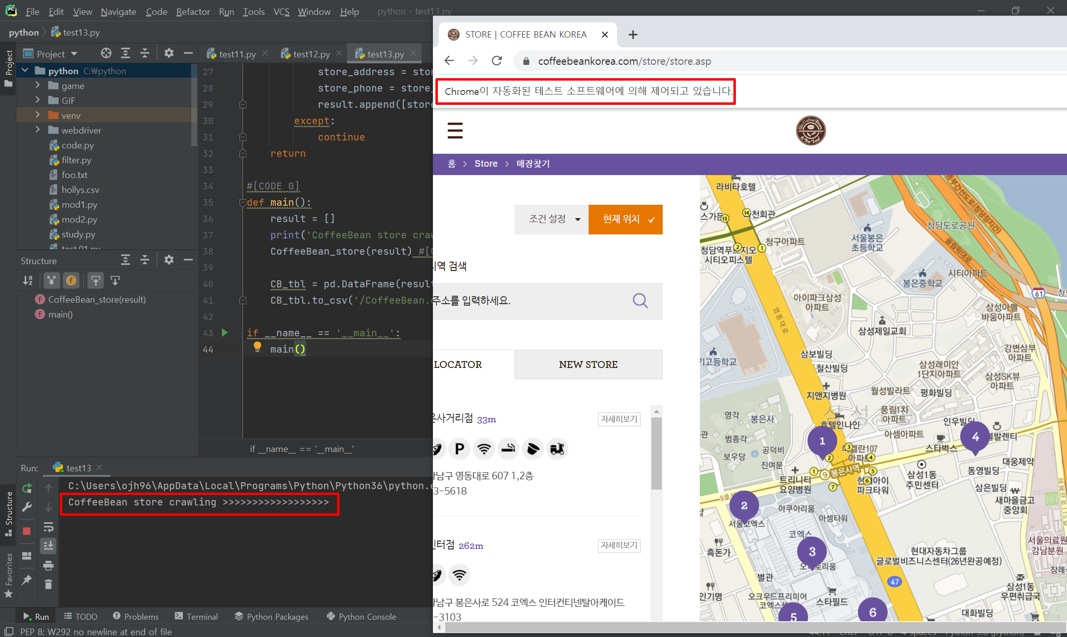 커피 브랜드 중 하나인 커피빈 전국 매장 정보를 크롤링 합니다.
