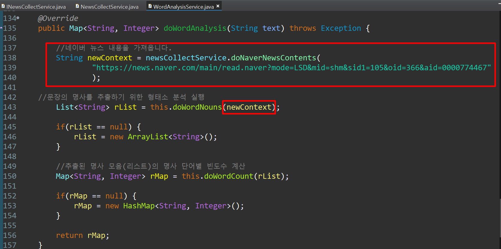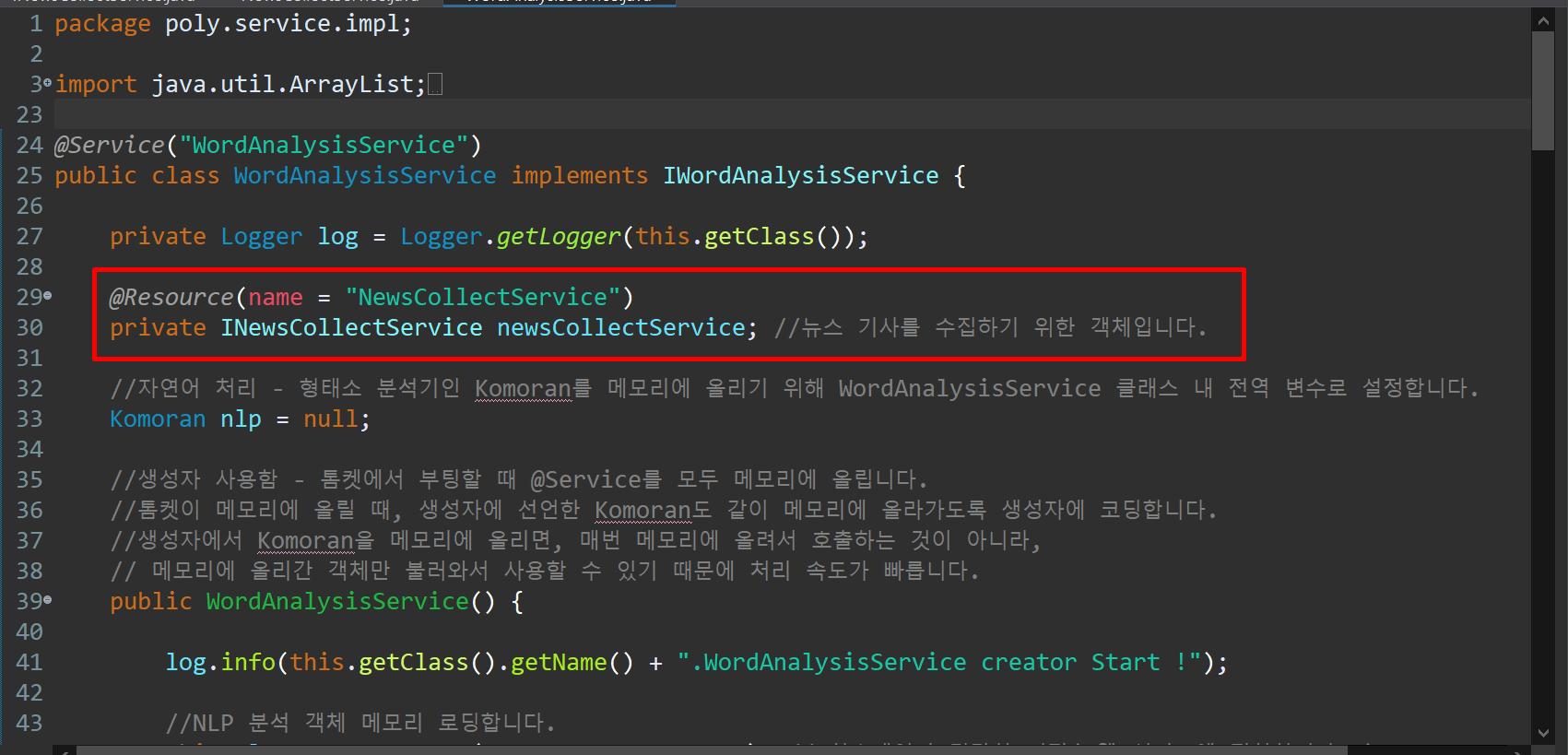 //자연어 처리 - 형태소 분석기인 Komoran를 메모리에 올리기 위해 WordAnalysisService 클래스 내 전역 변수로 설정합니다.