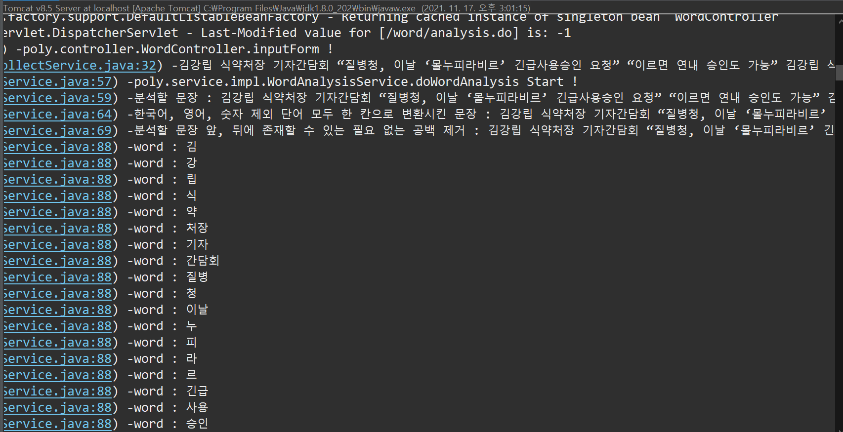 log.info("난 톰켓이 부팅되면서 스프링 프렝미워크가 자동 실행되었고, 스프링 실행될 때 nlp 변수에 Komoran 객체를 생성하여 저장하였다.");