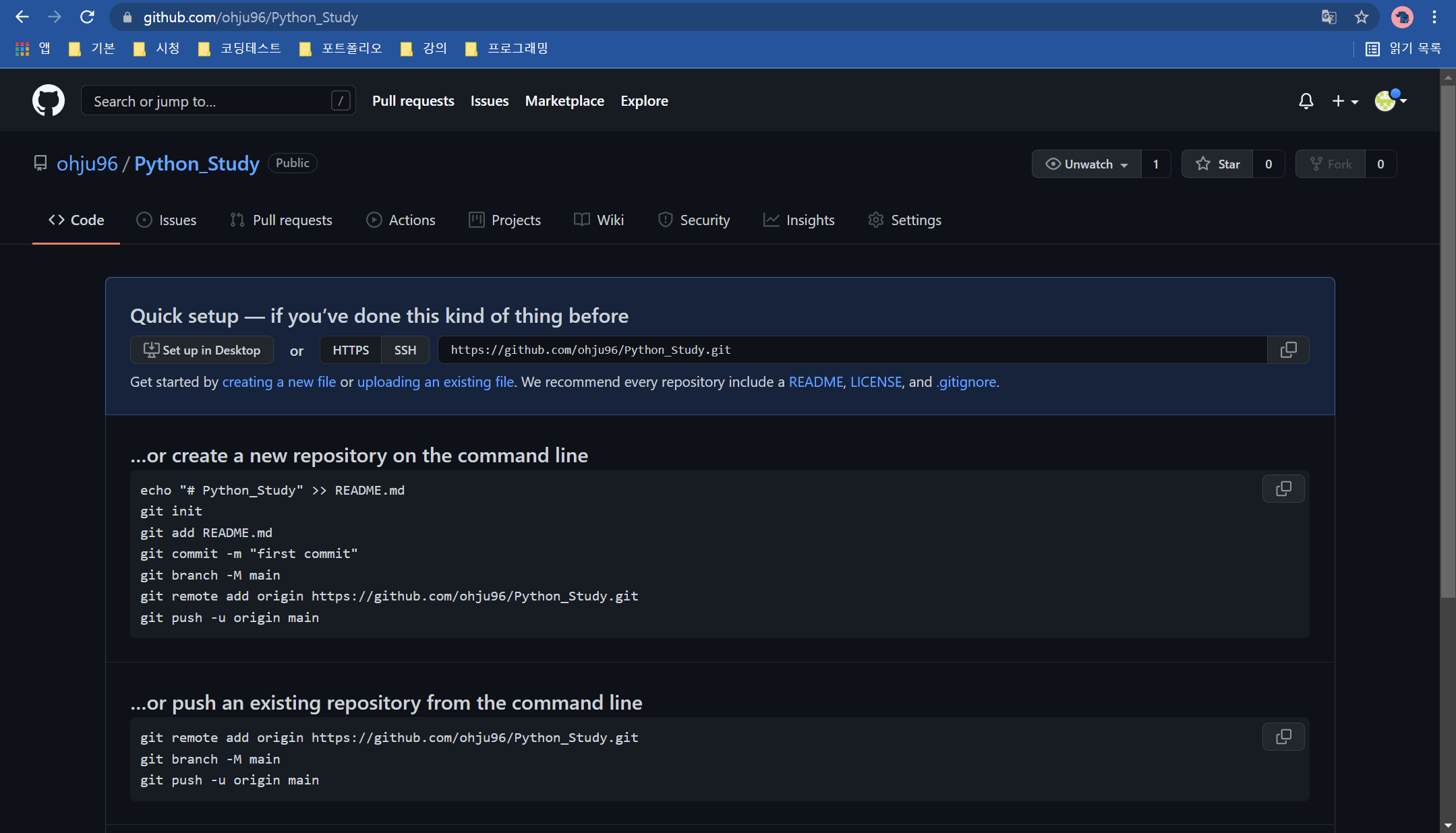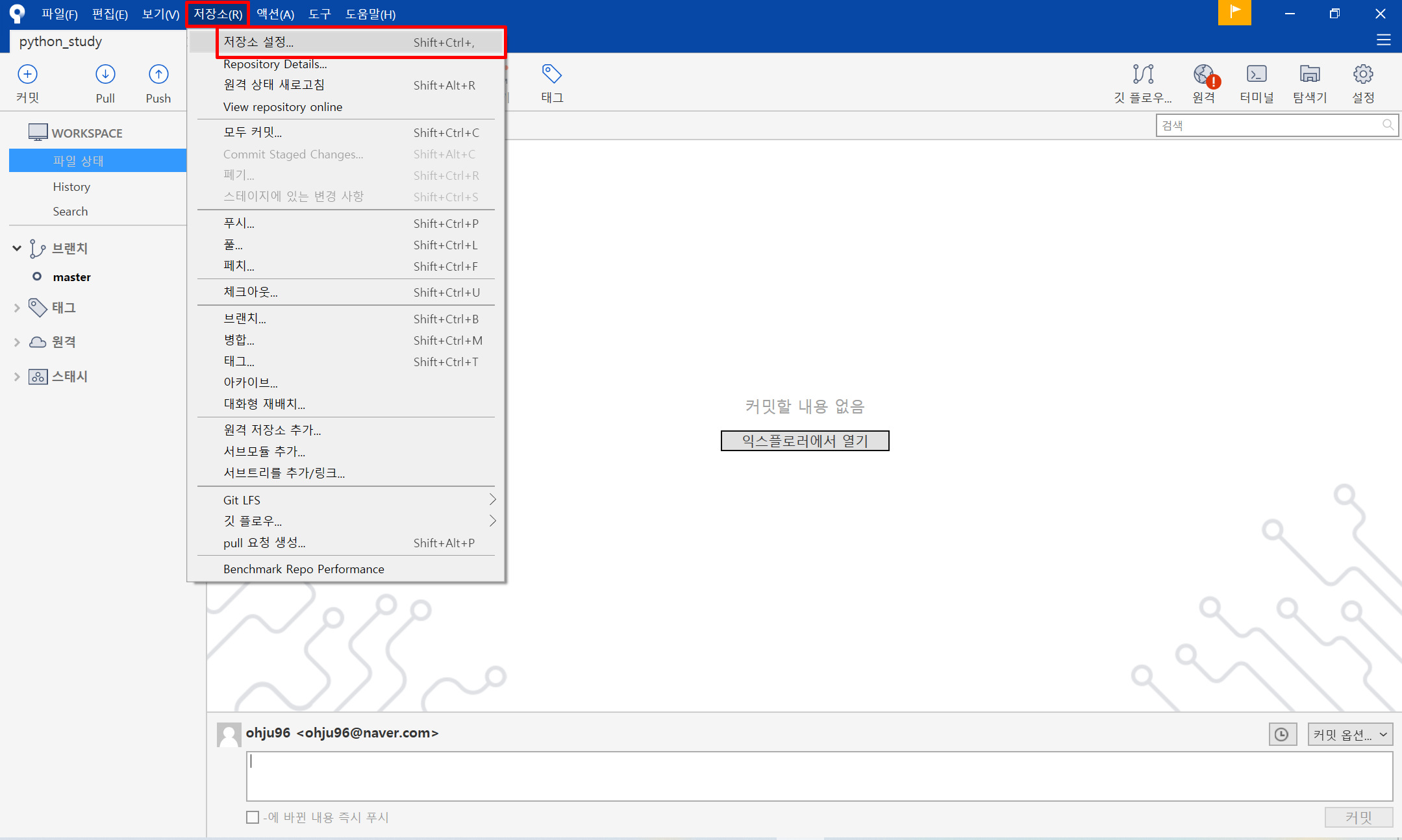 이렇게 기본 화면이 나왔습니다. 이제 깃허브와 로컬을 연결하기 위해 저장소에서 저장소 설정을 눌러줍니다.