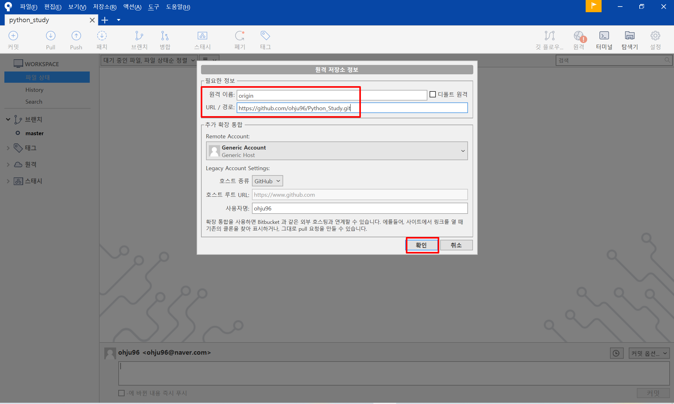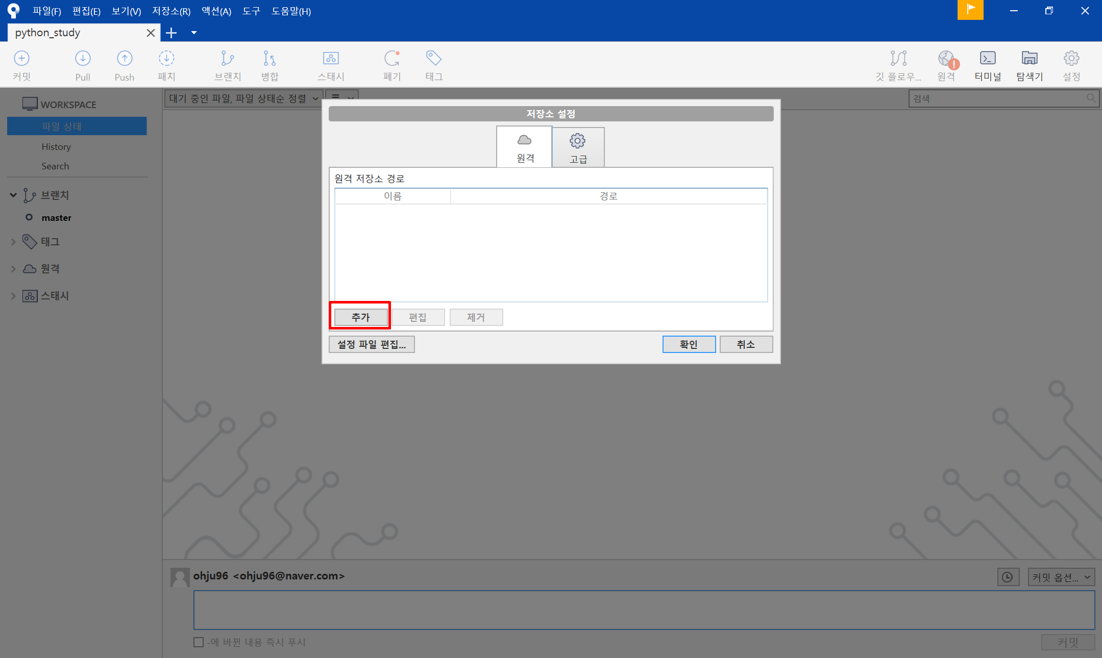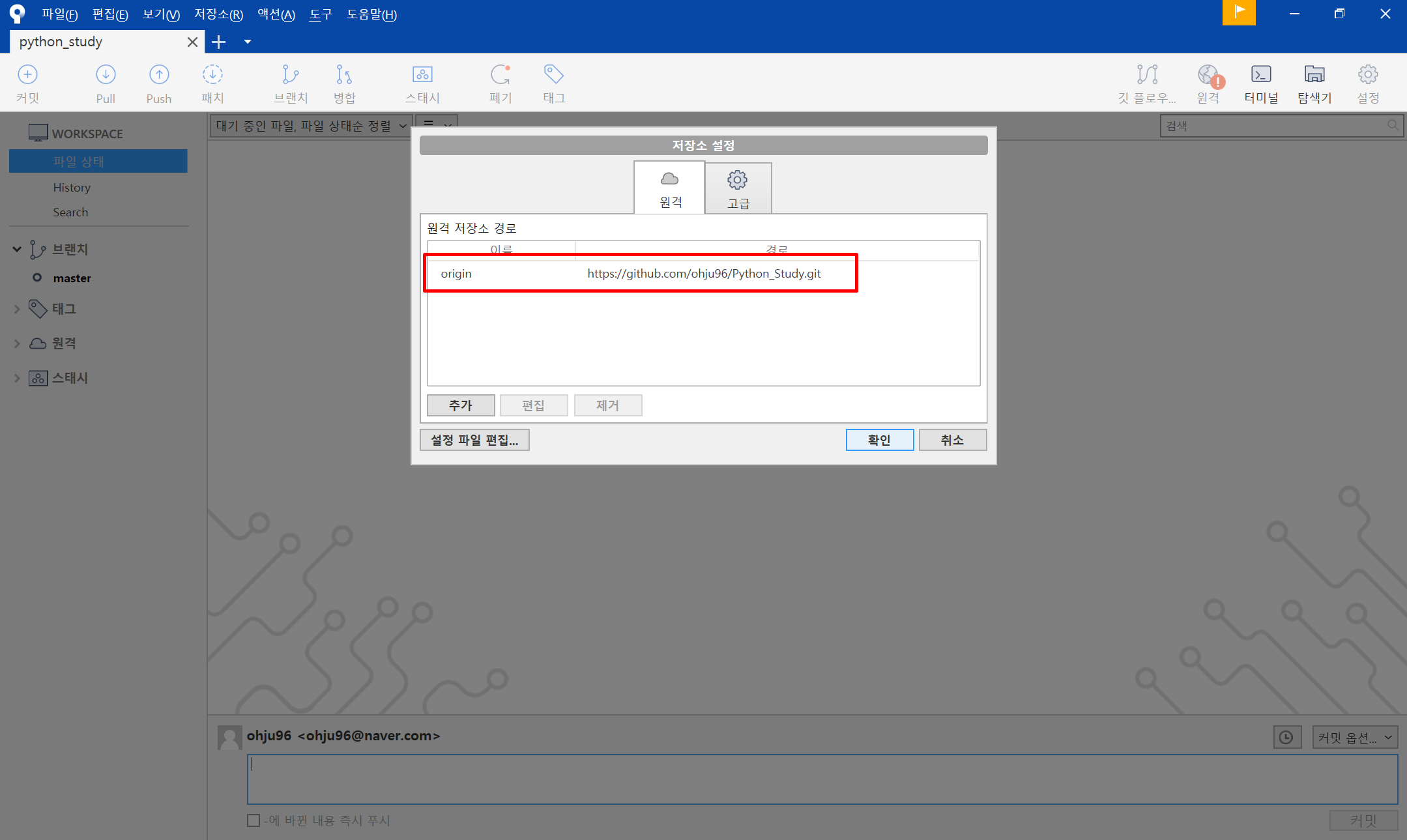 원격 이름을 정해주고 경로에 아까 복사한 깃허브 경로를 넣어주고 확인을 눌러줍니다.