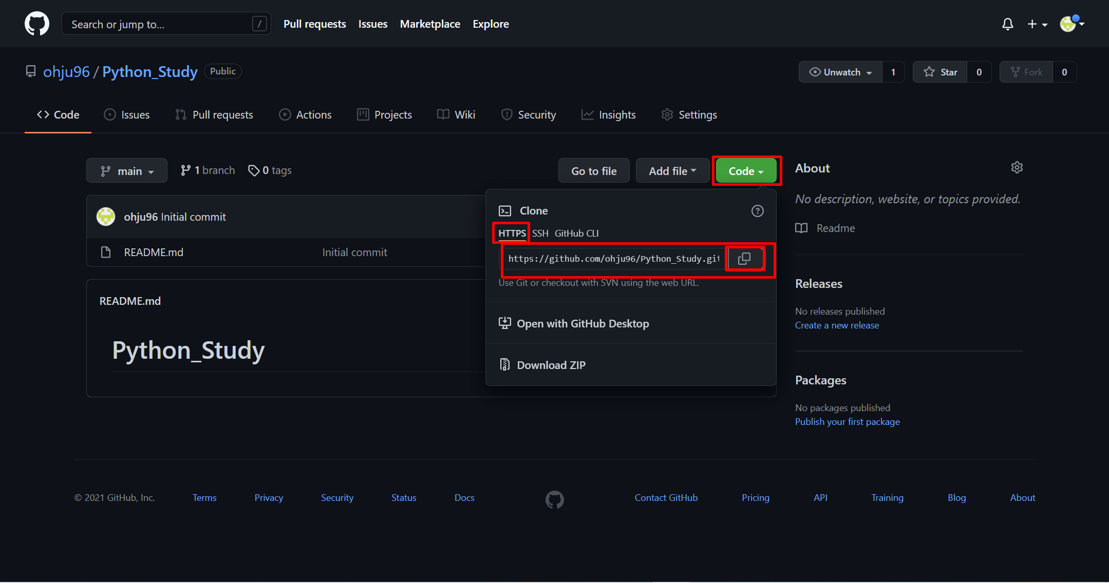 본인이 만든 깃허브 레파지토리에 있는 Code 버튼에서 HTTPS 링크를 복사해 옵니다.