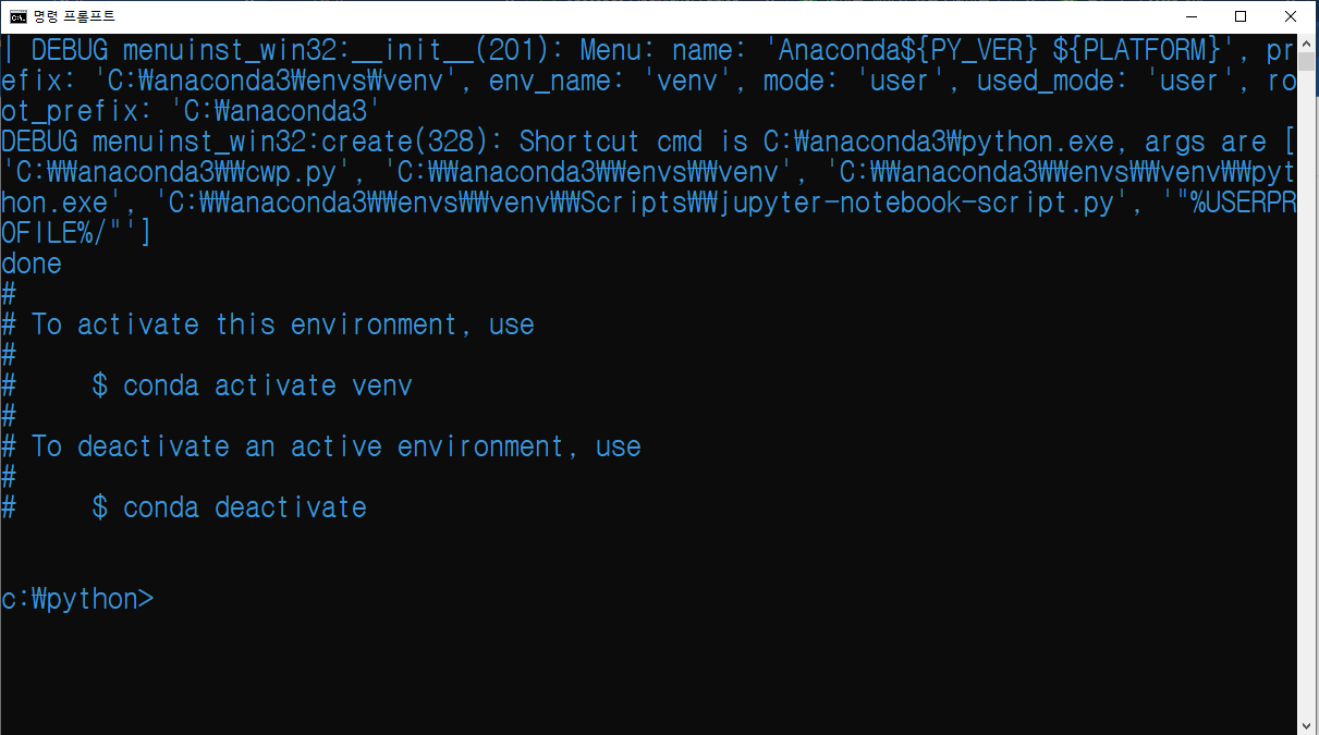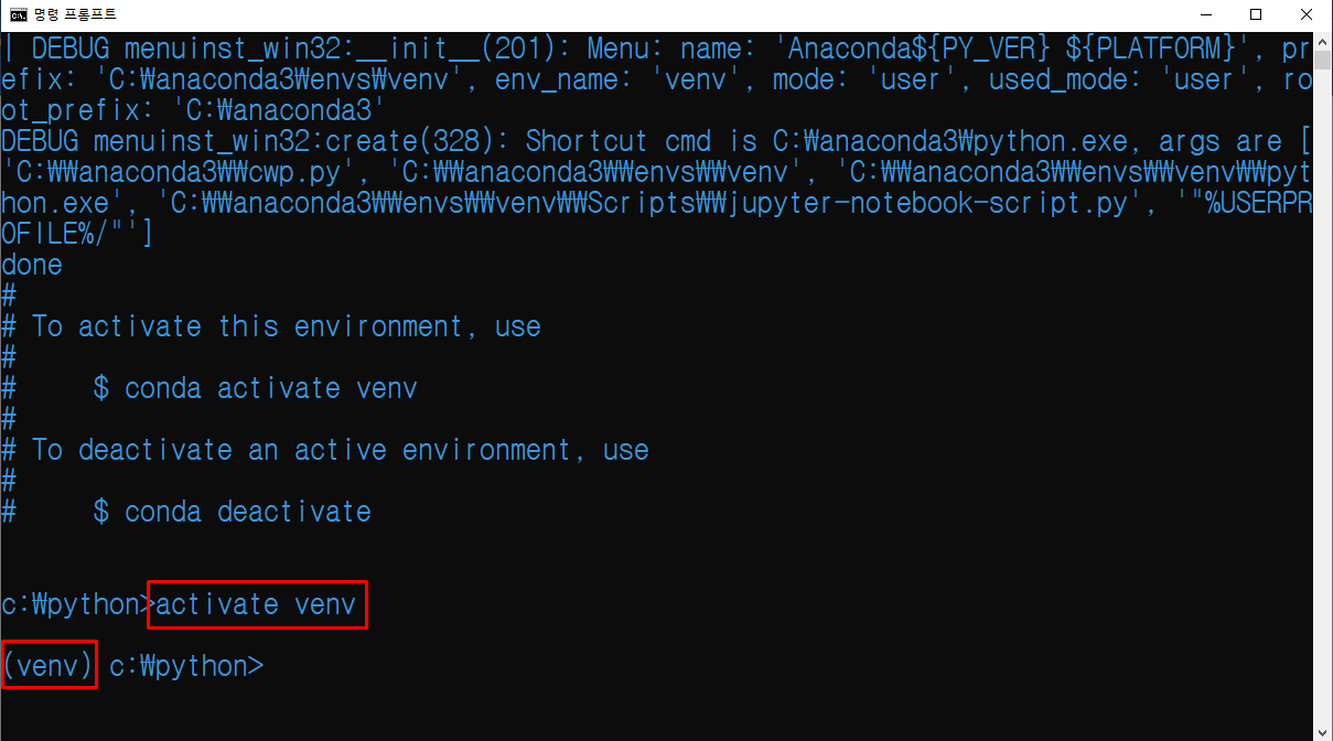 venv라는 문구가 입력 창에 나타나면 가상화 환경이 정상적으로 실행된 것 입니다.