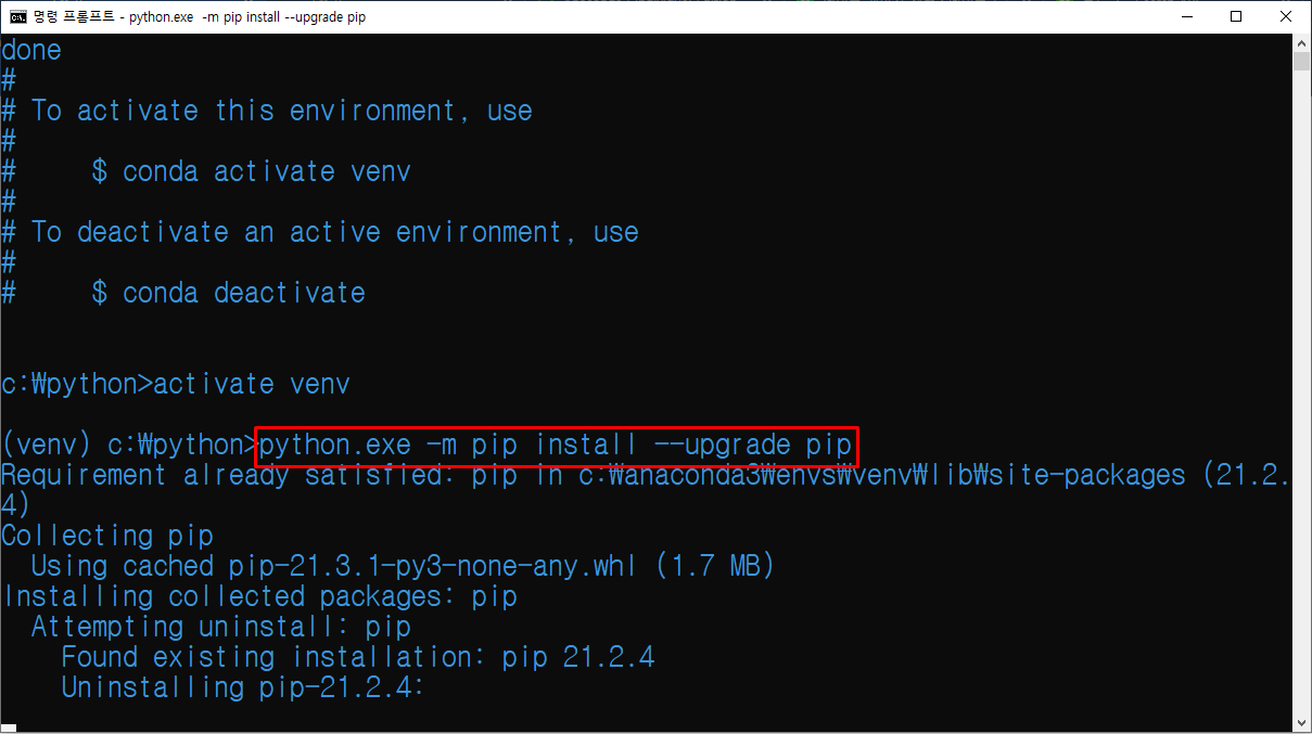 설치 명령어 pip를 업그레이드 합니다.