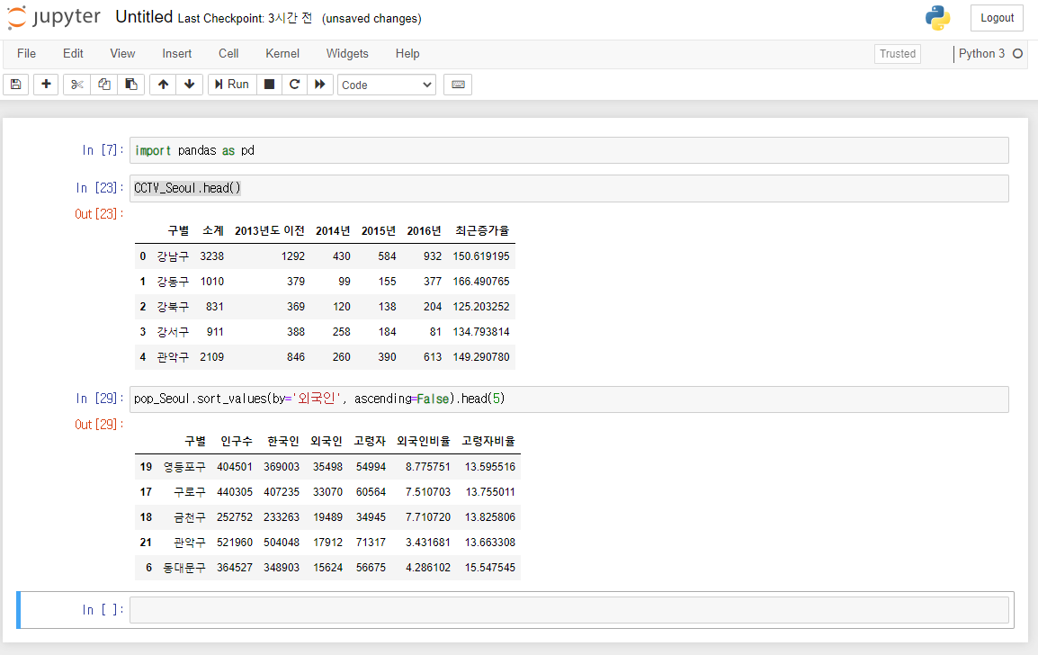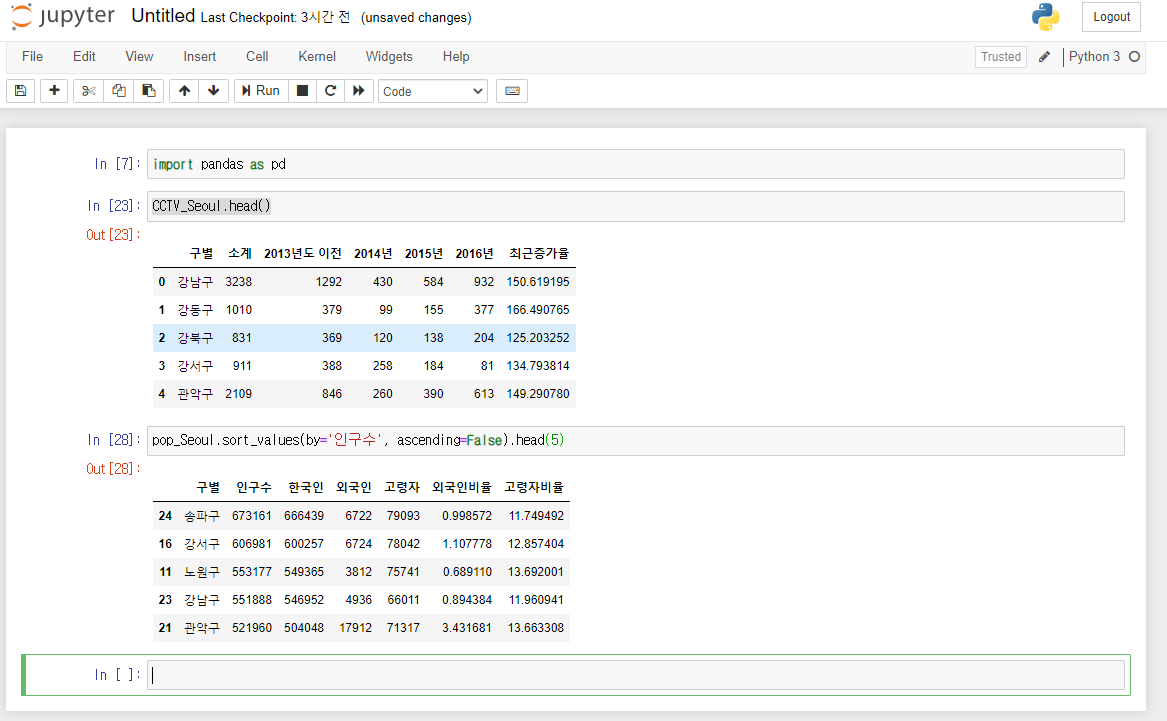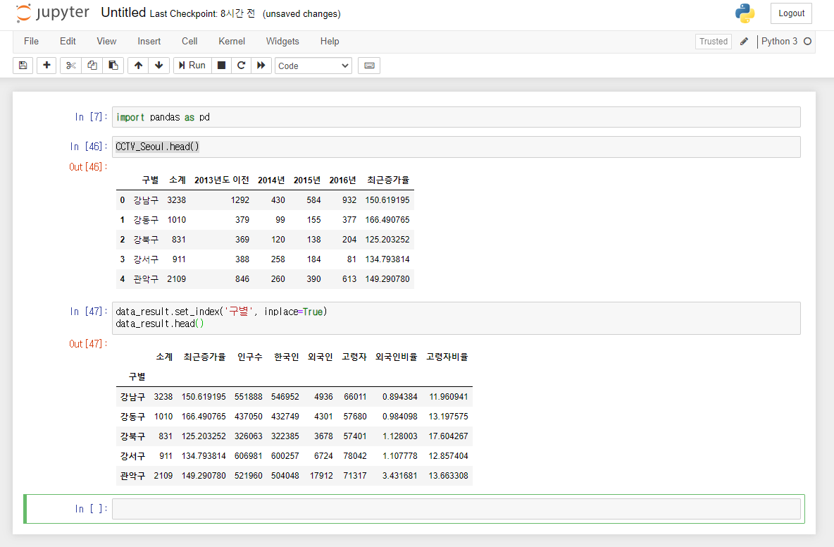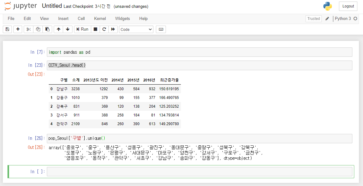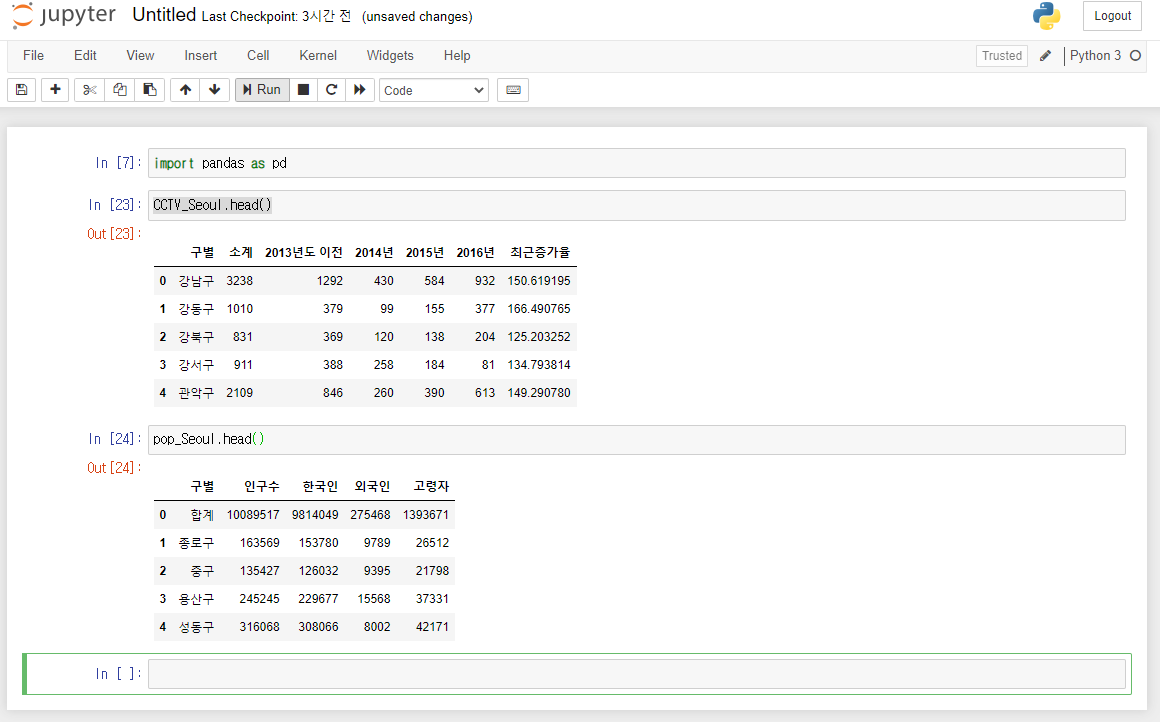 pandas를 이용해서 CCTV와 인구현황 데이터를 파악할 수 있습니다.