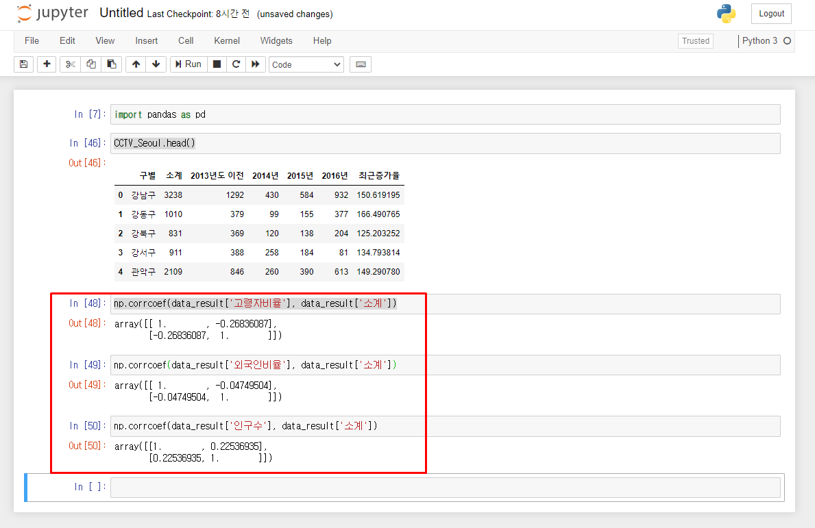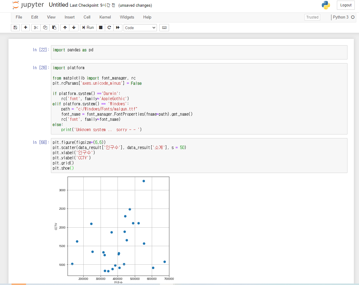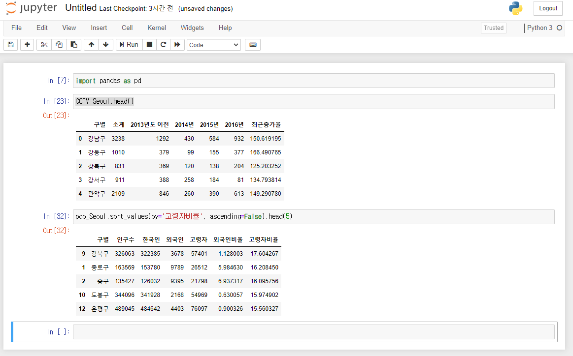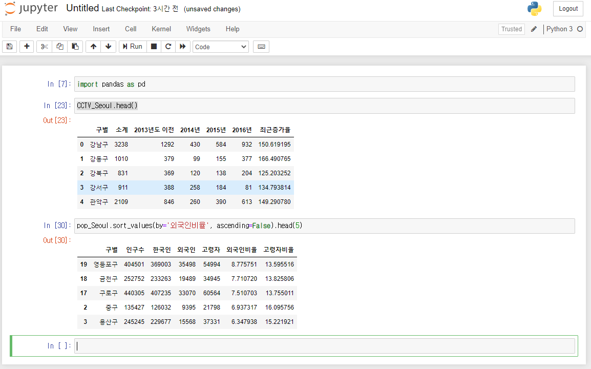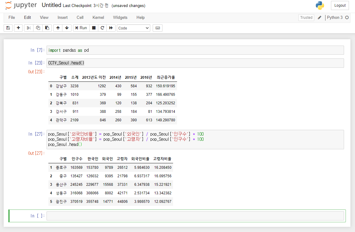 pandas를 이용해서 CCTV와 인구현황 데이터를 파악할 수 있습니다.