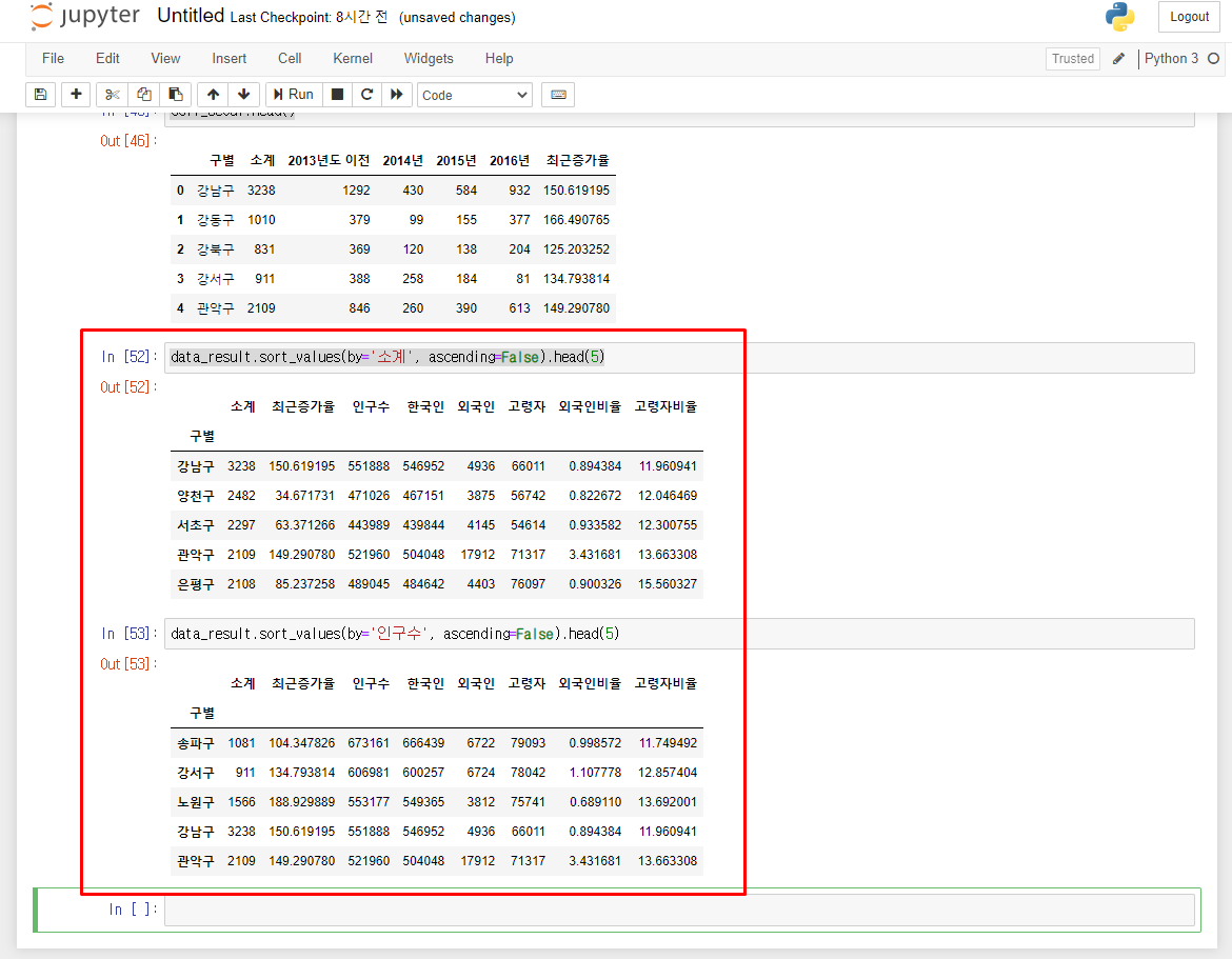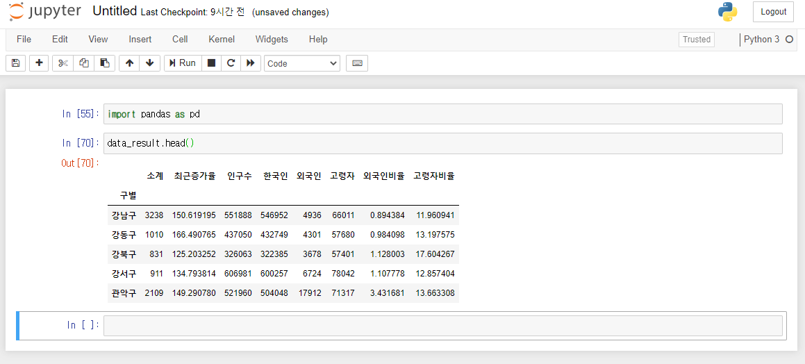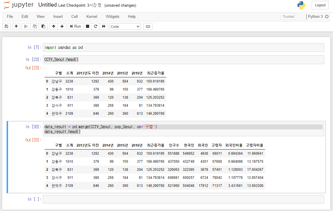 CCTV 데이터와 인구 현황 데이터가 merge된 결과 변수 data_result를 확인합니다.