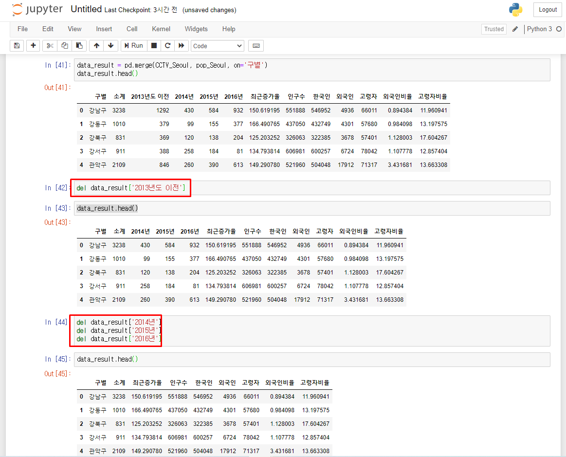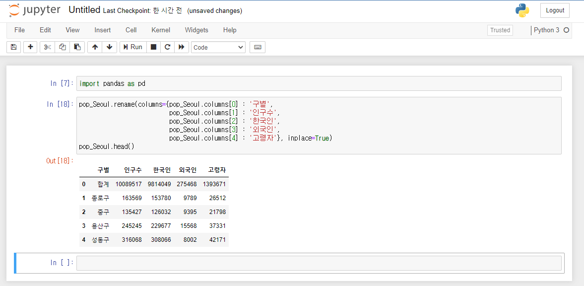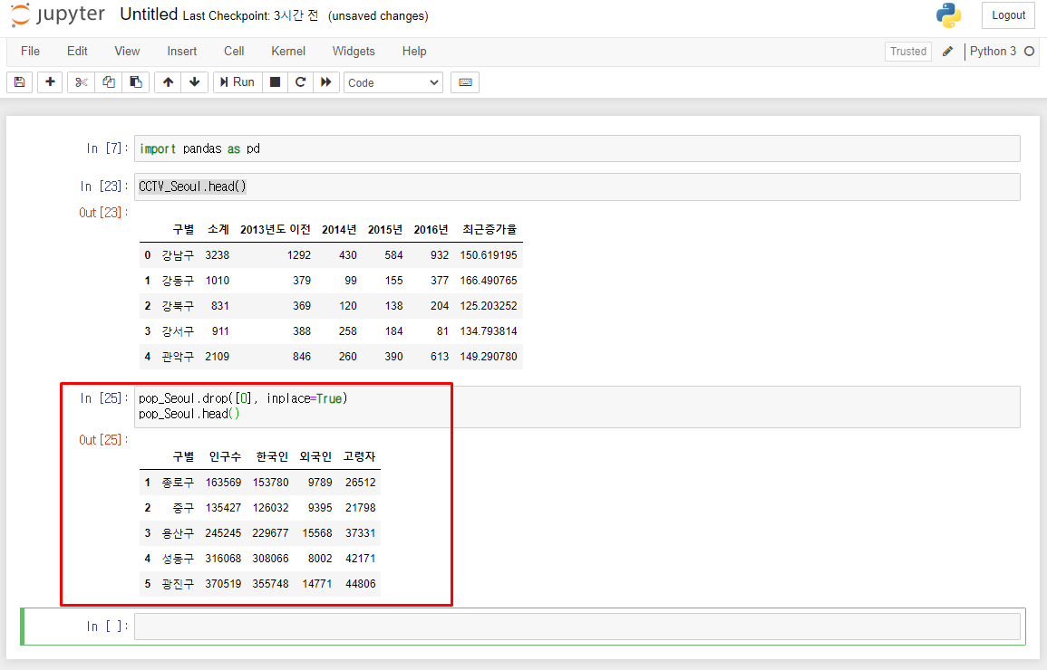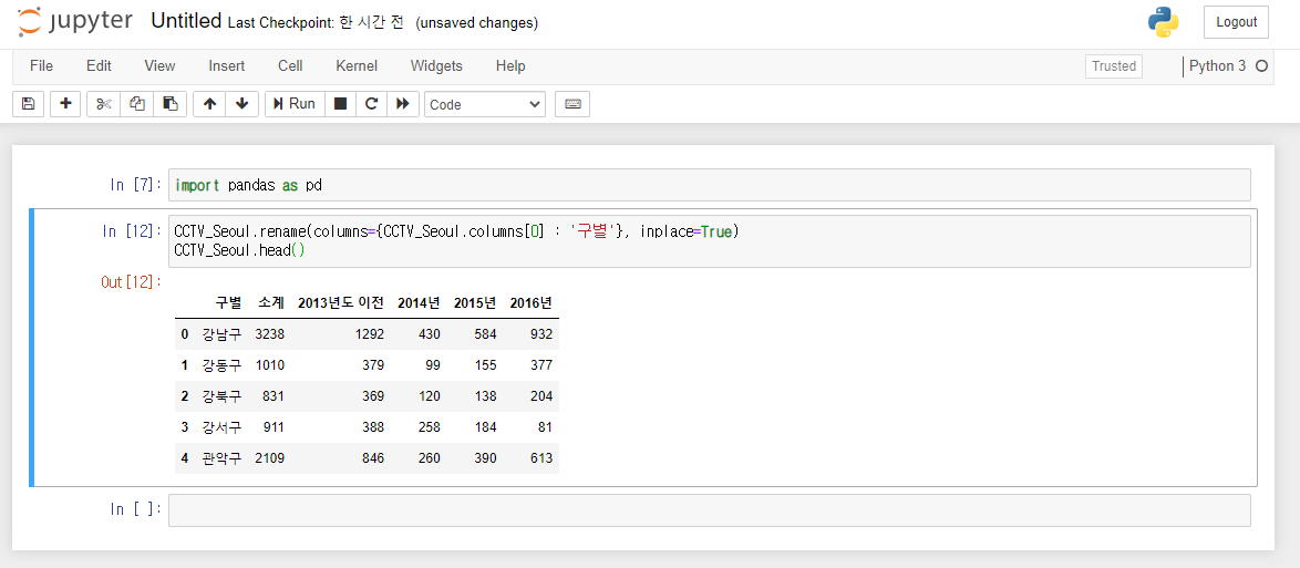 inplace=True는 실제 CCTV_Seoul이라는 변수의 내용을 갱신하라는 의미입니다.
