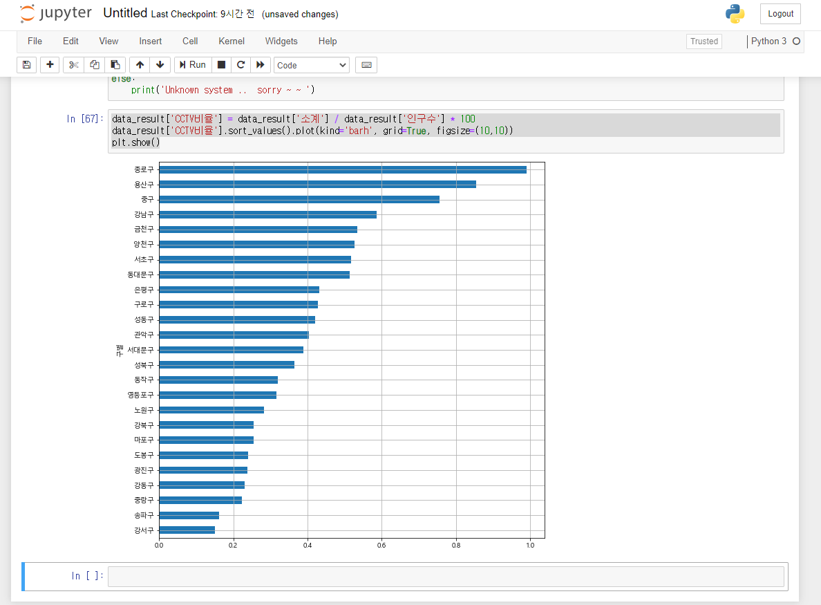 인구 대비 CCTV 비율을 계산해서 정렬합니다.