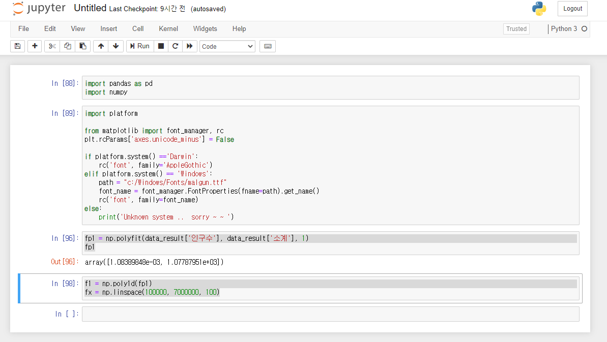 이를 위해 x축과 y축의 데이터를 얻어야 하는데 x축 데이터는 numpy의 linespace로 만들고, y축은 poly1d로 만듭니다.