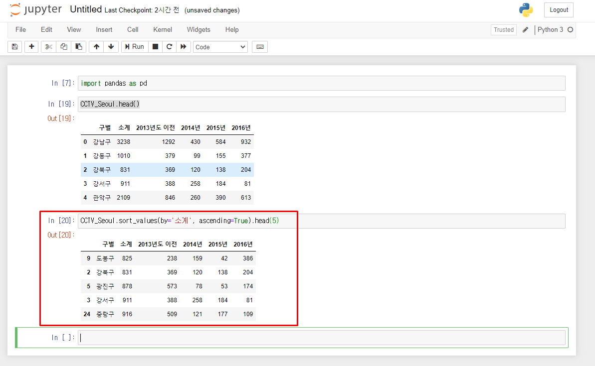 정렬된 내용을 통해 CCTV의 전체 개수가 가장 작은 수는 도봉구라는 것을 알 수 있습니다.