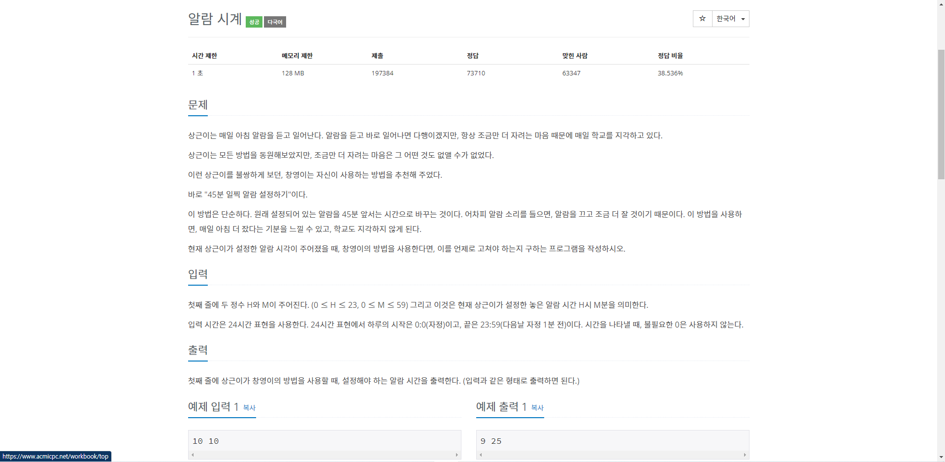 print(hour, min - 45)