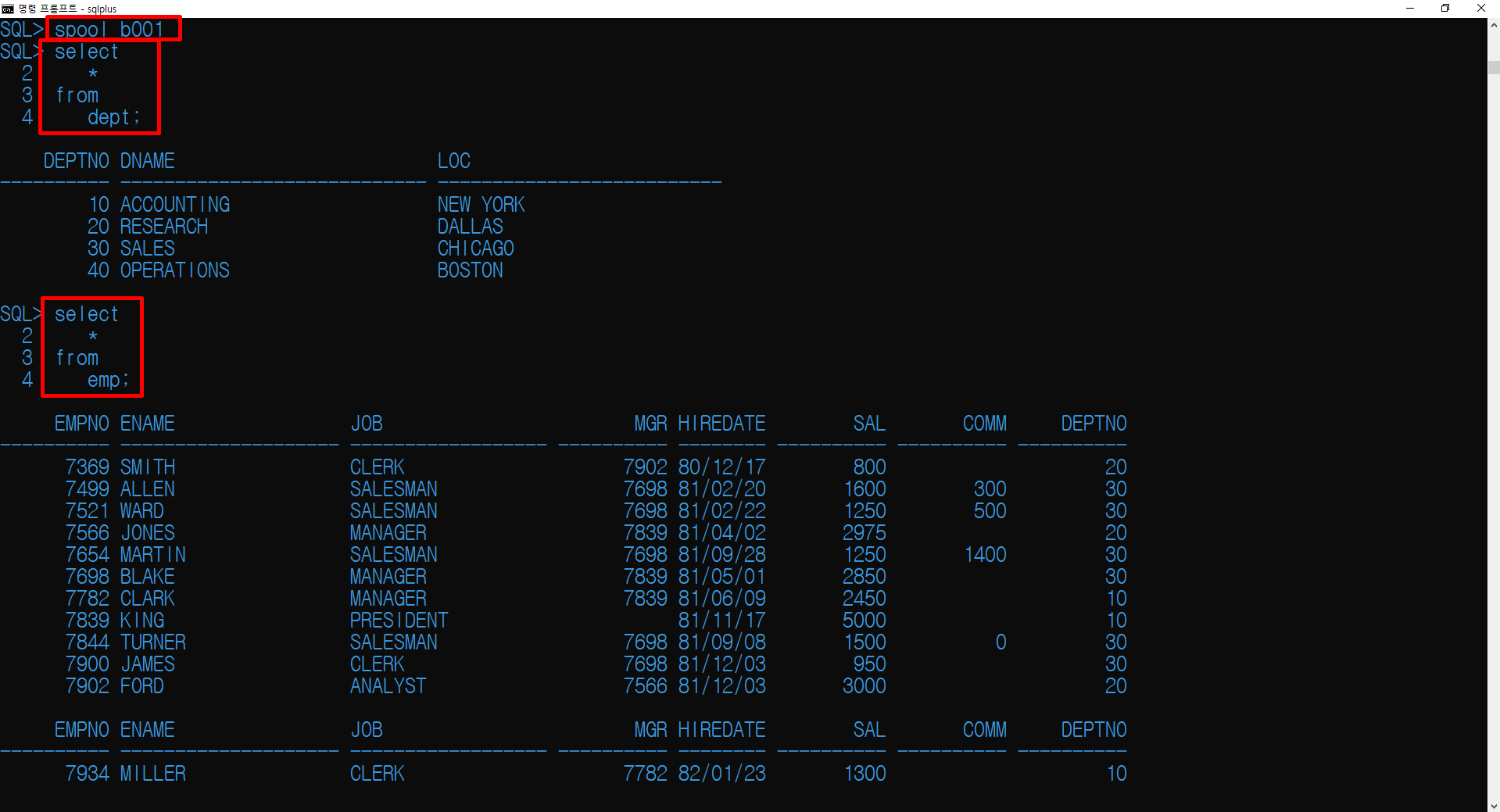 spool을 입력하여 갈무리 기능을 시작하고 dept와 emp를 조회했습니다.