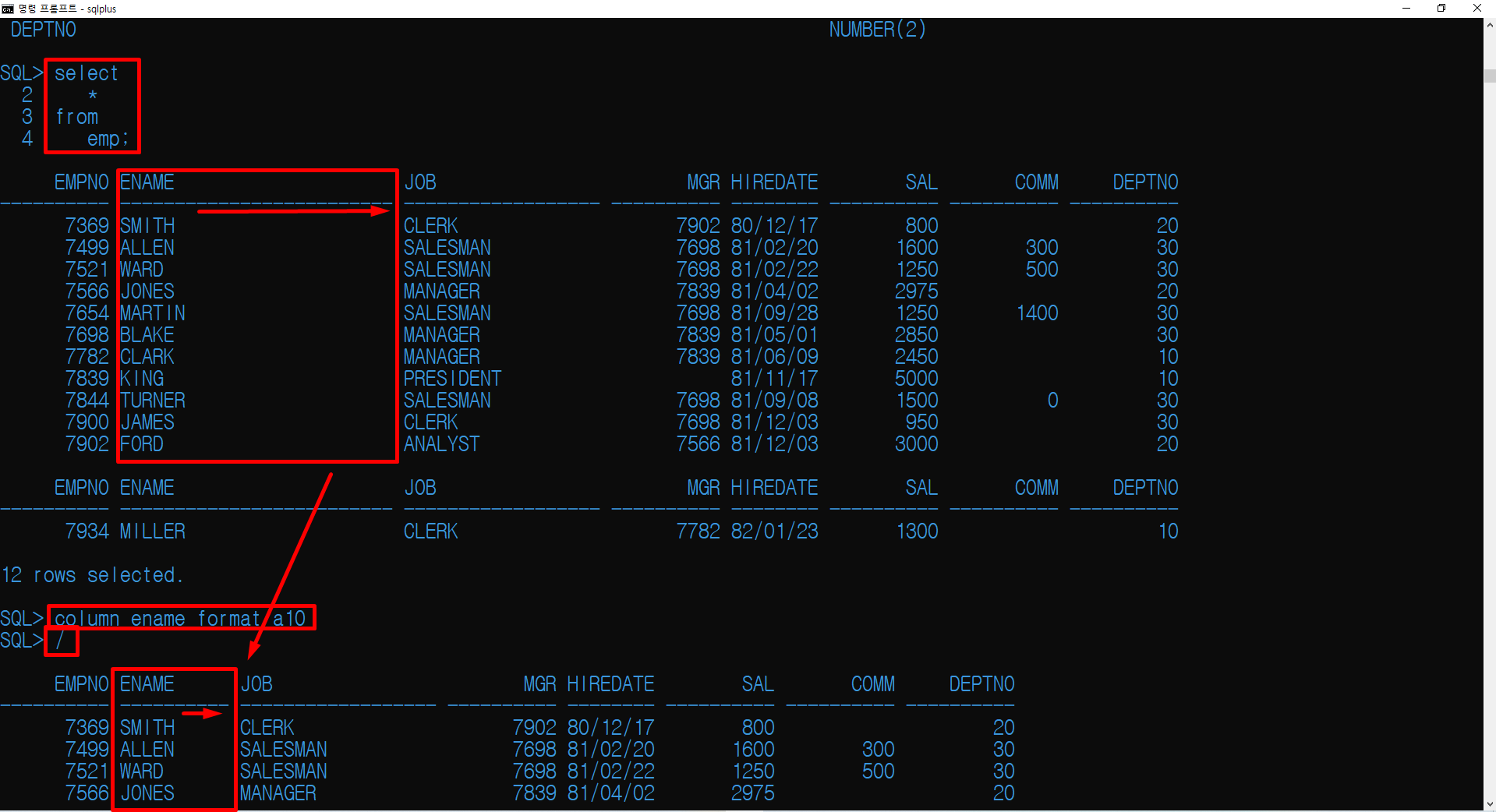 위에서 ename 옆에 공백이 아래에선 많이 줄어든 것을 볼 수 있습니다.