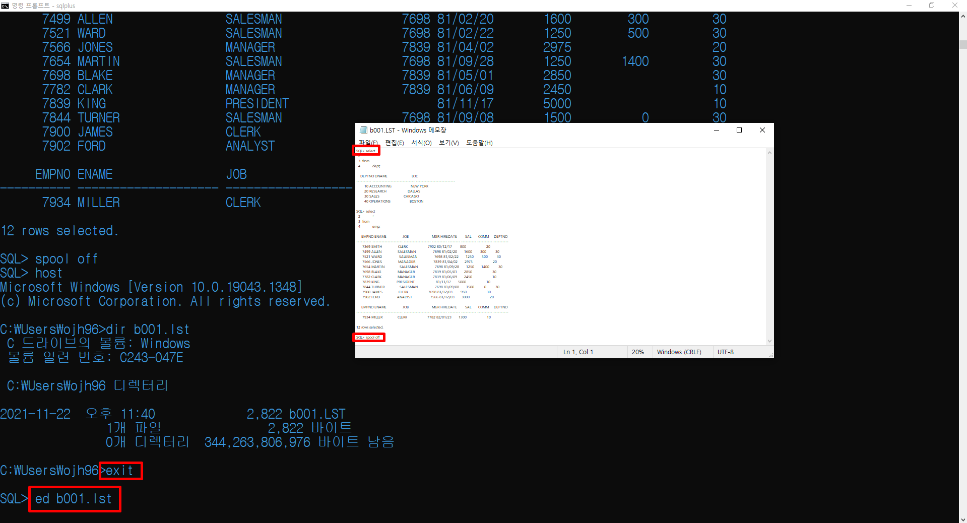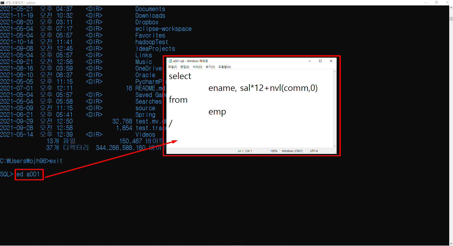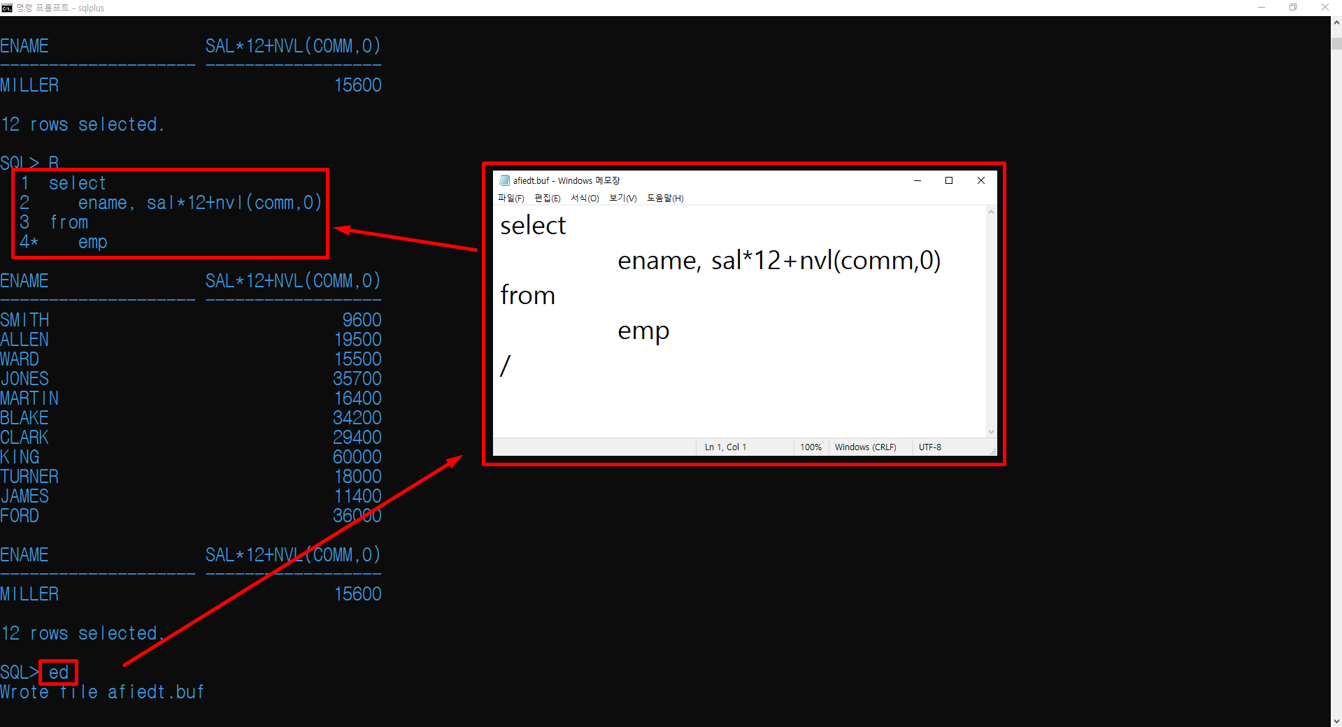 ed를 입력하면 메모장이 실행되면서 마지막에 입력했던 SQL 명령문을 불러옵니다.