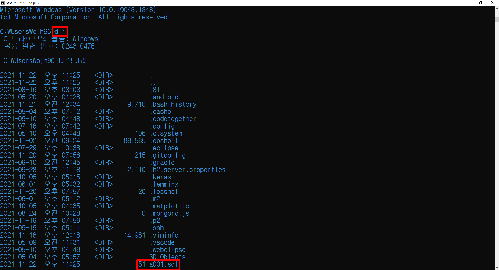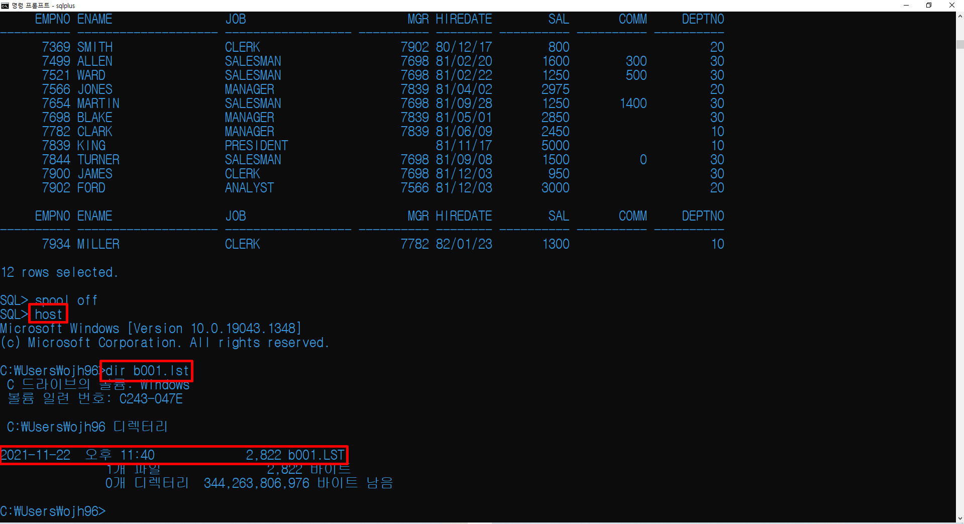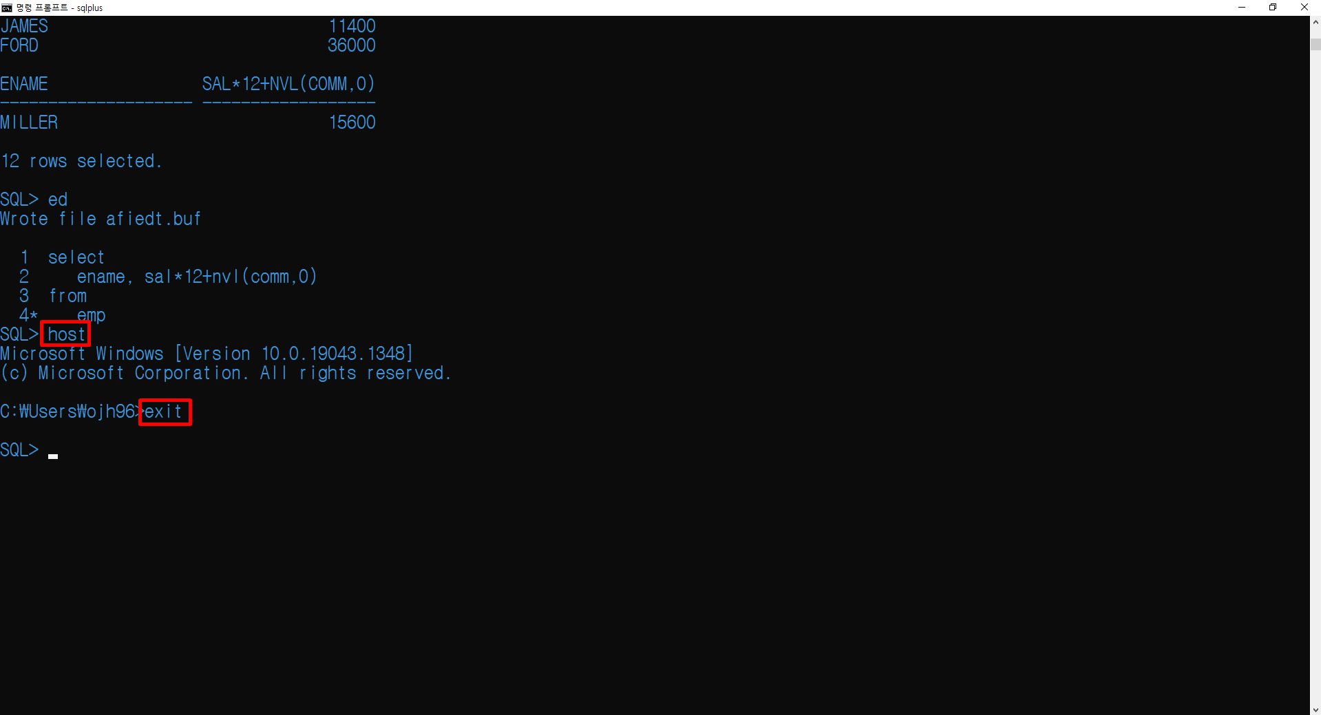 OS 환경을 사용하기 위해 HOST 명령어를 통해 DOS 환경으로 나갈 수 있고 EXIT 명령어를 통해 다시 SQL 환경으로 돌아올 수 있습니다.
