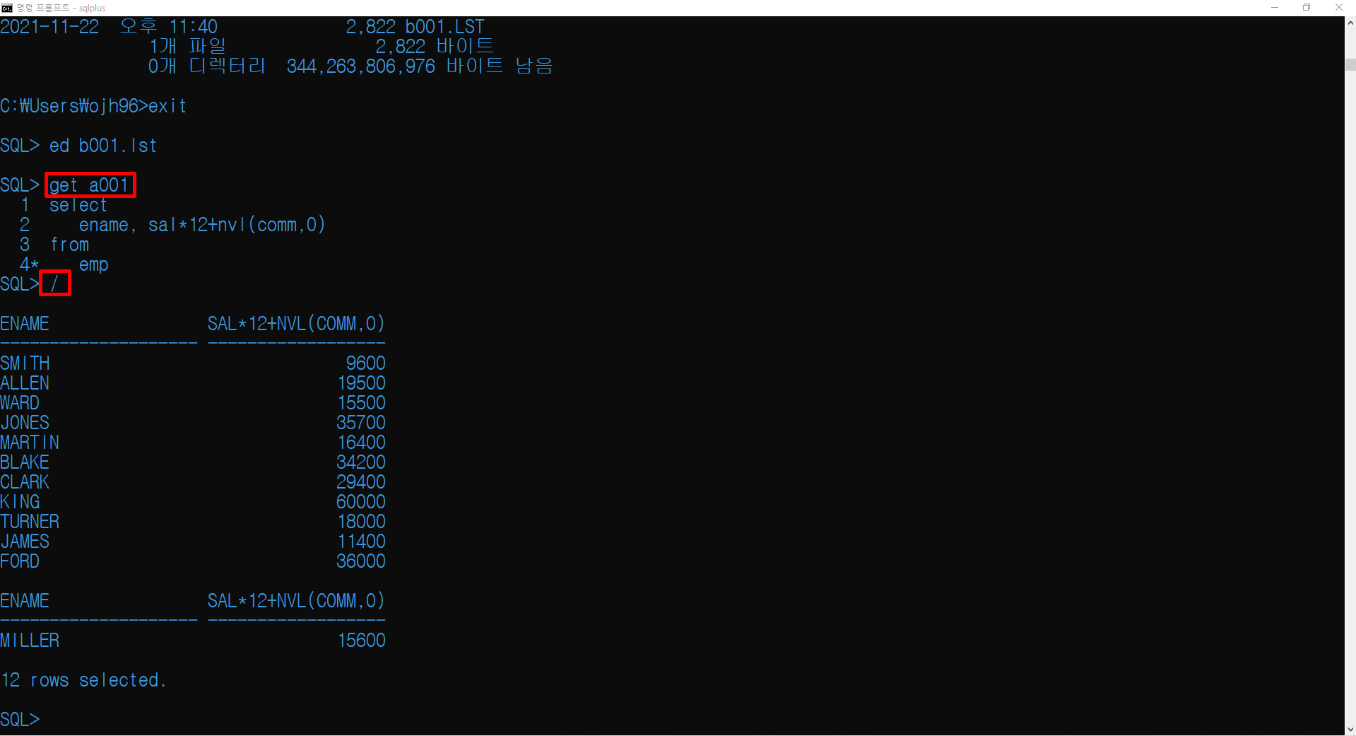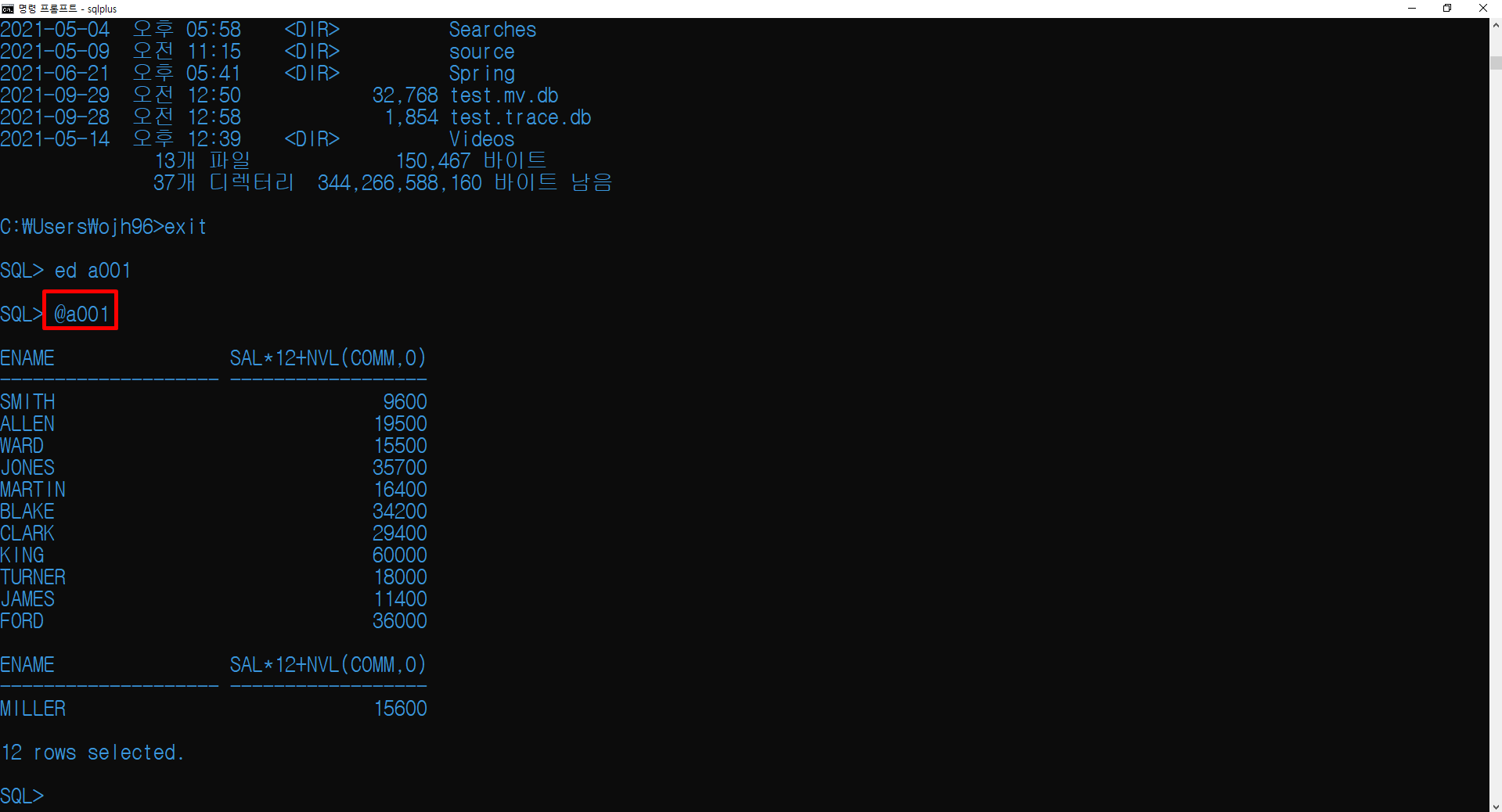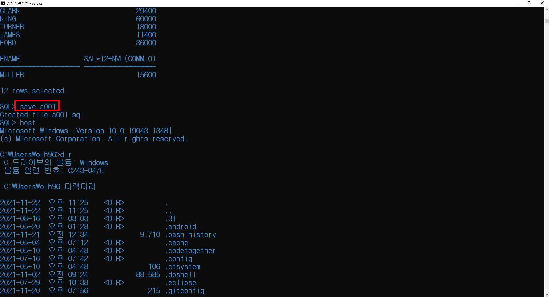 SAVE로 연봉을 계산하는 쿼리를 a001로 저장하고 HOST 명령어로 DOS로 나가서 dir 명령어를 통해 저장이 실제로 되었는지 확인했습니다. 그 후, exit 명령어를 통해 다시 오라클 환경으로 돌아옵니다.