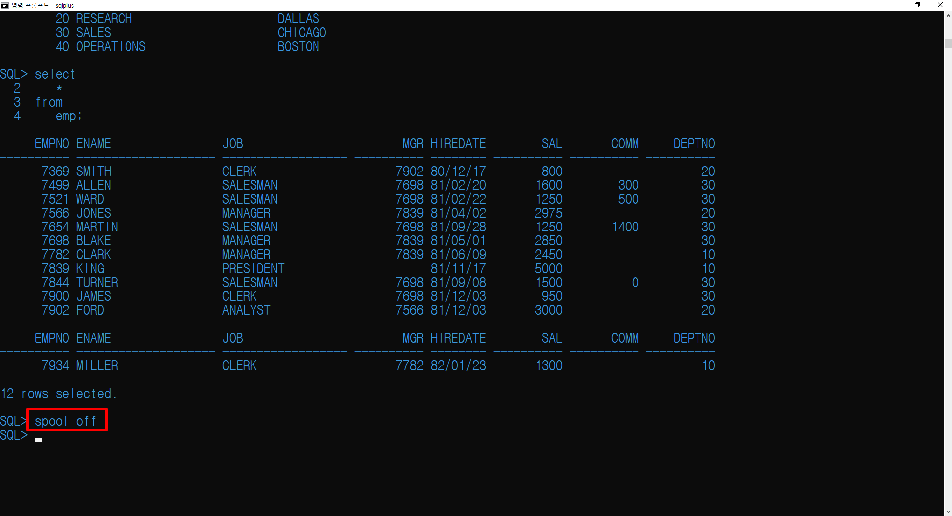위에서 갈무리한 내용을 저장하기 위해서 spool off 명령어를 반드시 입력해 줍니다.