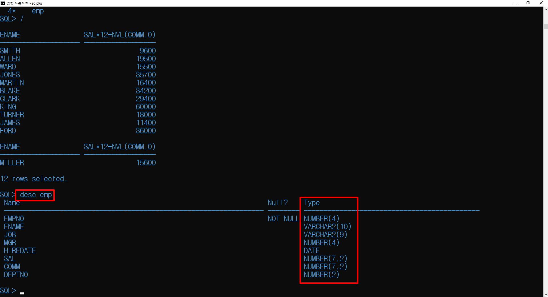/ 명령어를 통해 버퍼(afiedt.buf)에 저장된 쿼리문(이전 쿼리문)을 실행합니다.