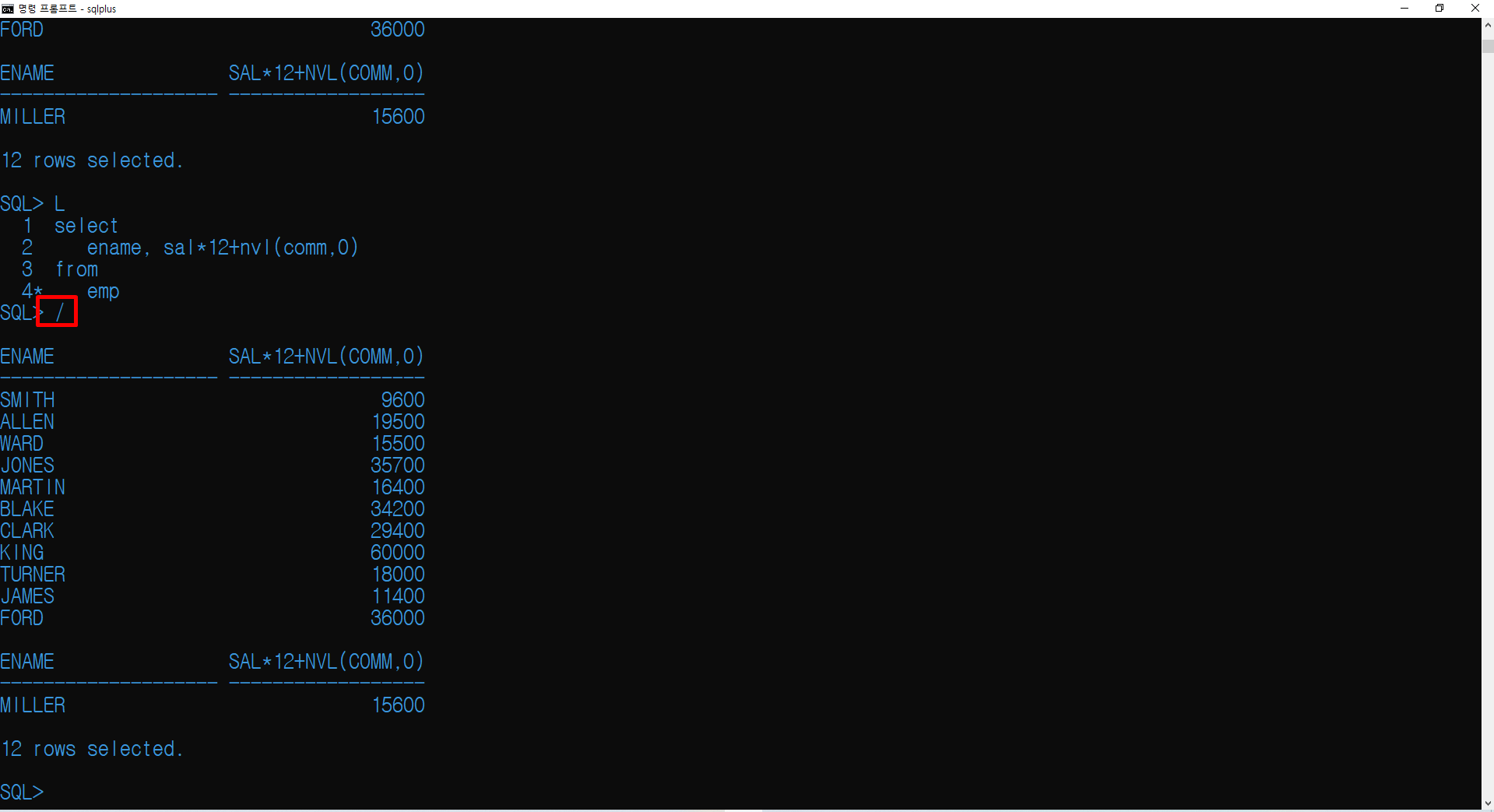 버퍼에 저장된 쿼리문을 실행시키기 위해서 /를 입력합니다.