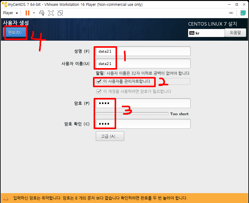 이름과 관리자 체크해 주고 암호를 설정한 뒤 완료를 눌러줍니다.