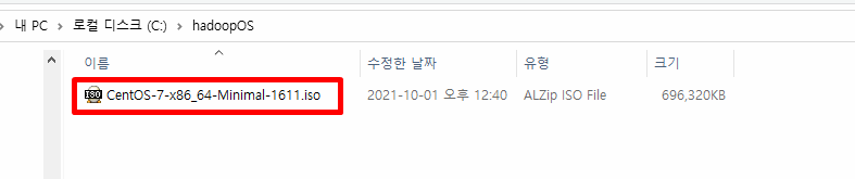 hadoopOS 폴더 안에 다운 받은 CentOS ISO를 넣어둡니다.