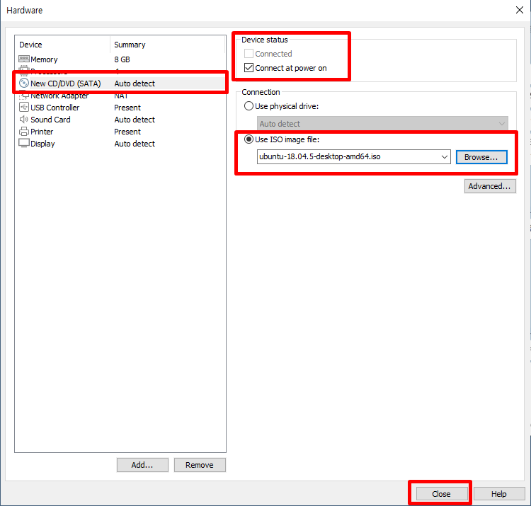 커넥션은 아까 다운로드 받은 ubuntu.iso 파일을 잡아주면 됩니다.