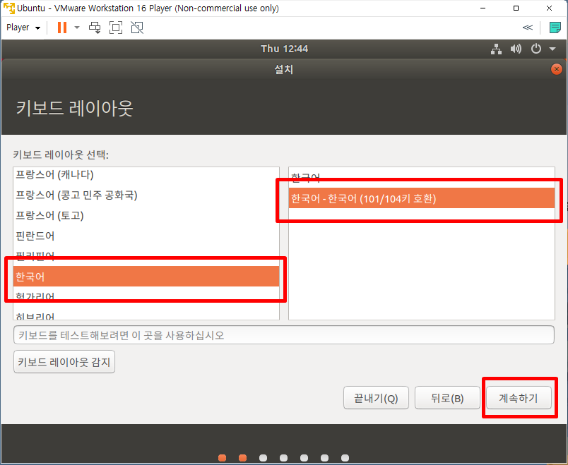 여기서 계속하기가 안 보이는 경우도 있는데 일반 설치를 한 번 클릭해 두고 tab 키를 눌러서 계속하기 까지 내려주면 된다. 아래는 안 보이니까 대충 계산해서 엔터를 눌러주자.