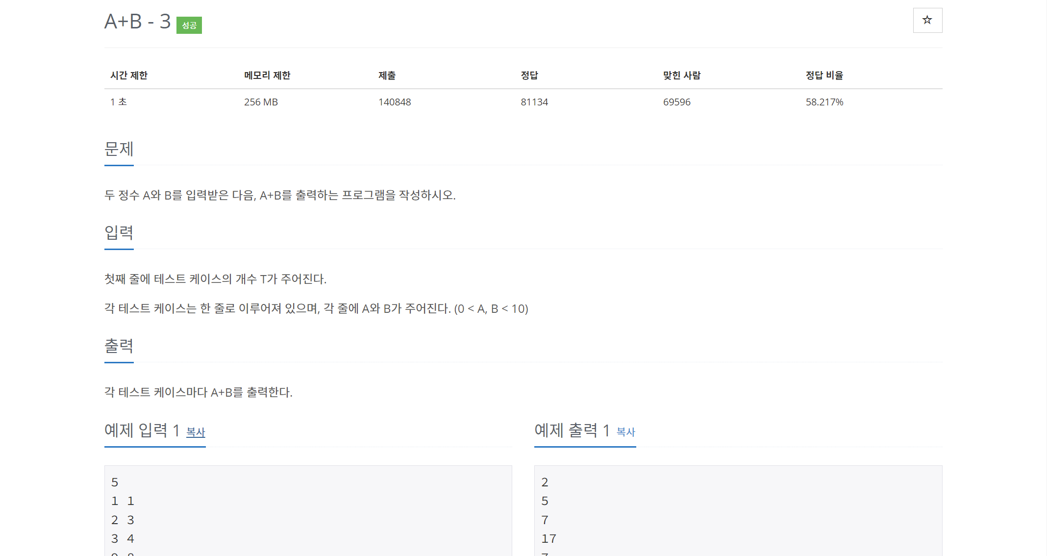 먼버 반복할 테스트 케이스를 입력 받고 입력 받은 테스트 케이스 만큼 반복해 주면서 a,b값을 입력 받고 print문으로 더해서 출력해 줍니다.