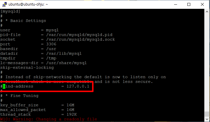 vi로 위 경로로 들어가서 bind-address 쪽을 0.0.0.0으로 바꿔주려고 하니까 오류가 생깁니다.