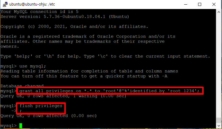 grant all privileges on *.* to 'root'@'%'identified by 'root 1234';